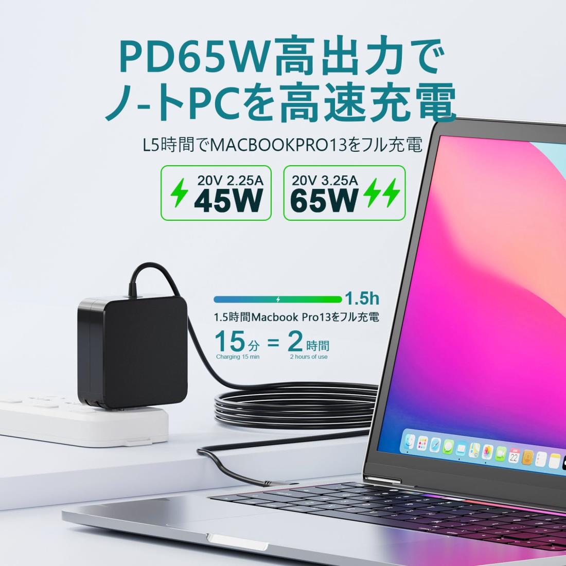 【Type-C ACアダプター】Power Deliveryの技術により、お使い機器を接続した場合、接続されているデバイスの種類を自動検知し、お使い機器を最適な出力で急速充電が可能です。入力:100-240V 50-60Hz 1.5A; 出力65W: 5V 3A, 9V 3A, 12V 3A, 15V 3A, 20V 2.25A, 20V 3.25A, PPS: 3.3-21V/3A。これPD対応の45W/65W タイプc充電器を備え、ノートパソコンからタブレット端末、スマートフォンまで幅広い機器に急速充電できます。