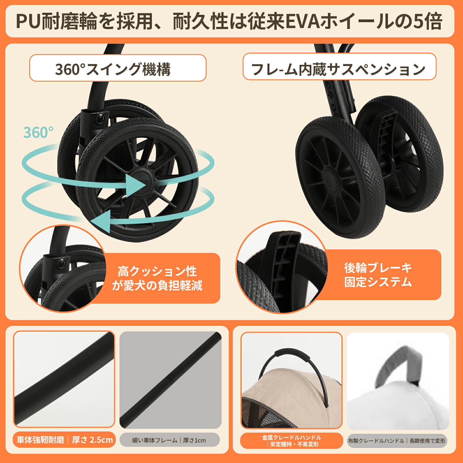 この犬用カートは安定性と耐摩耗性を兼ね備えた防摩耗素材の4輪設計で、コンクリート道から砂利道まで様々な路面に適応する耐久性を実現。