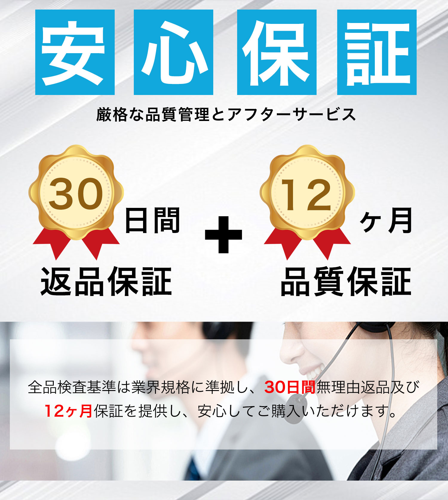安心保証:30日間返品保証+12ヶ月品質保証(特典:取扱説明書に記載の連絡先へ登録すると、保証期間が18ヶ月に延長される)。製品に問題があれば当社チームが迅速に対応。