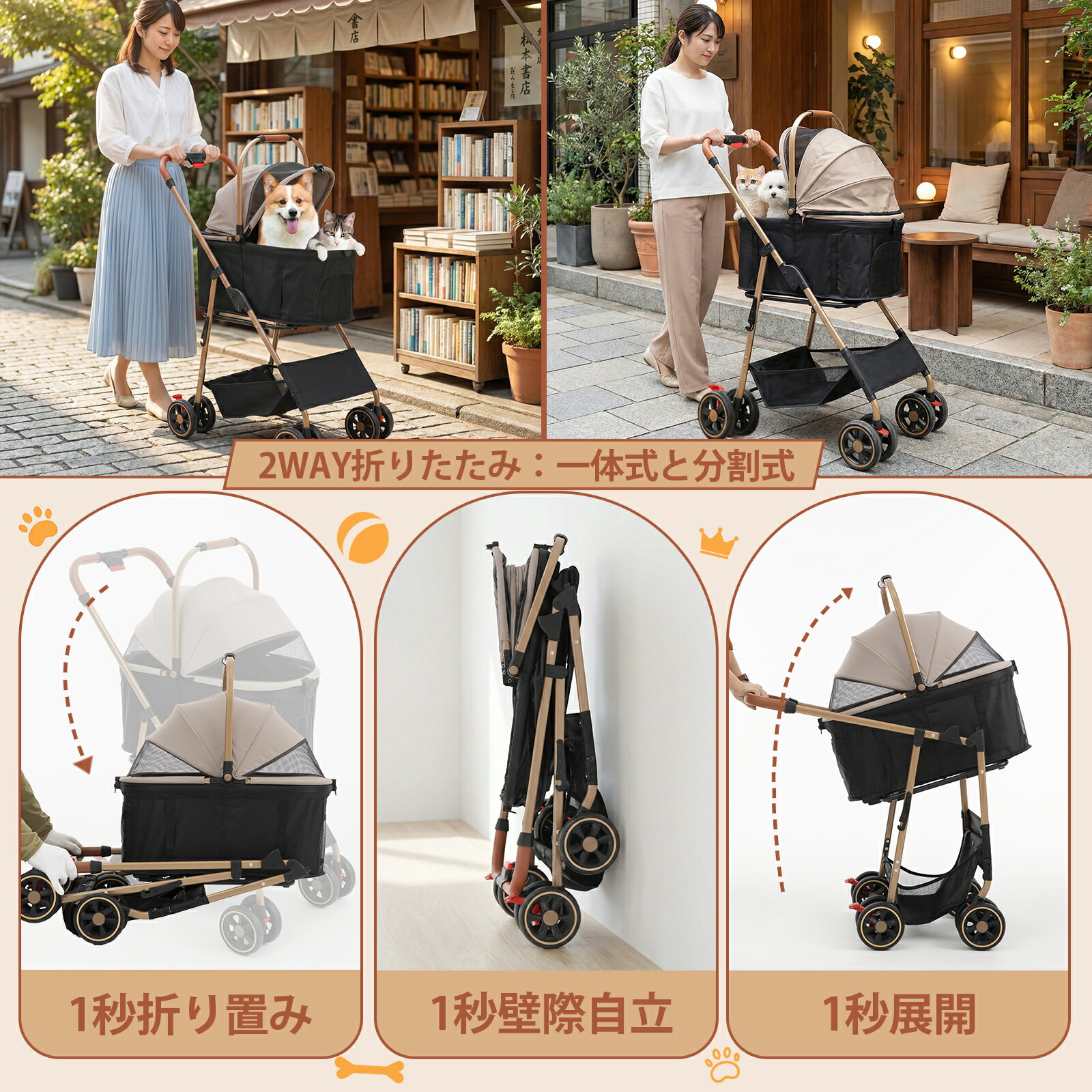MILA&LOUISペットカート 多頭 小型犬&猫 中型犬 犬 カート 分離型 全体型 折りたたみ ベビーカー 人気 犬用カート バギー 軽量 キャリー 四輪 耐摩耗ホイール 前輪3 取り外し