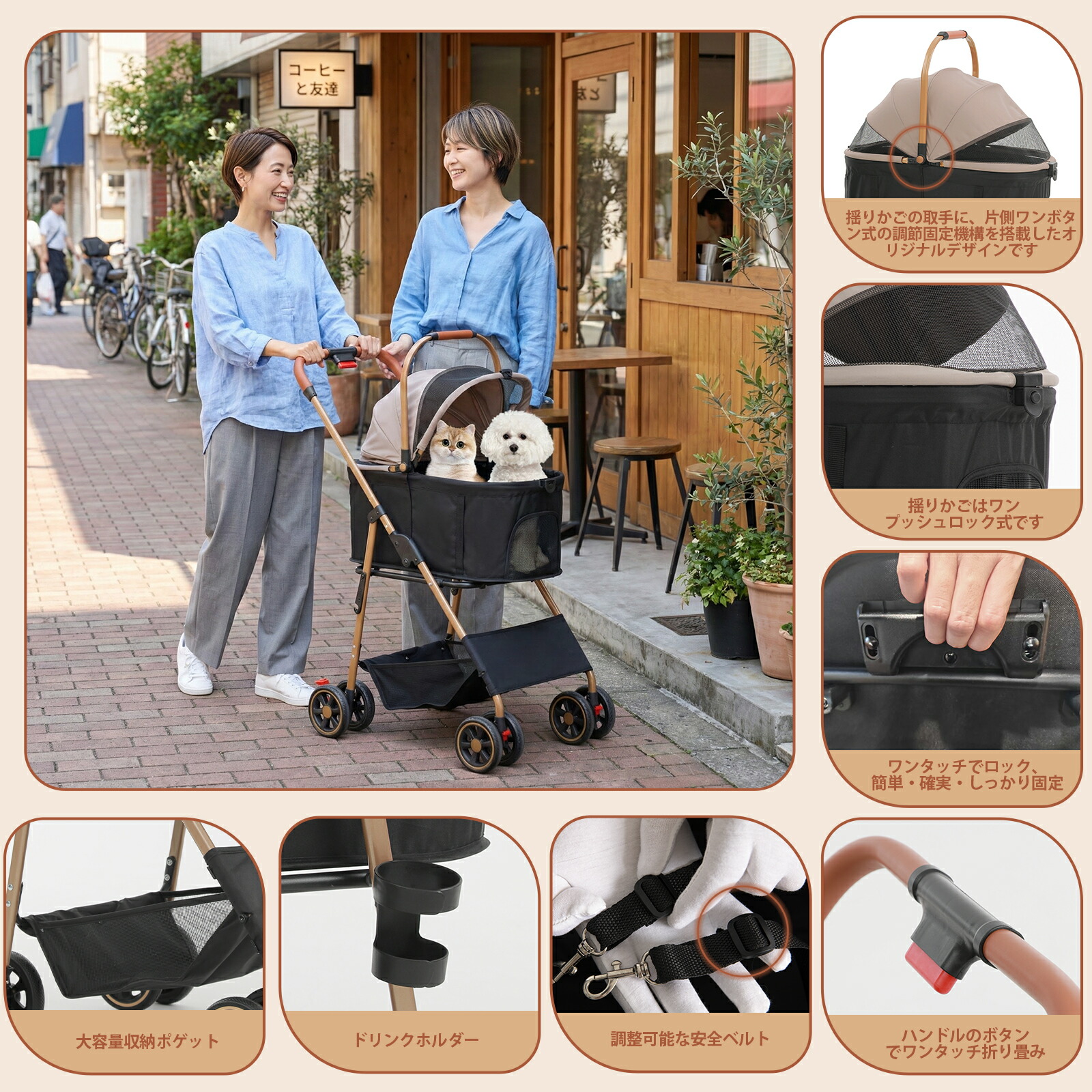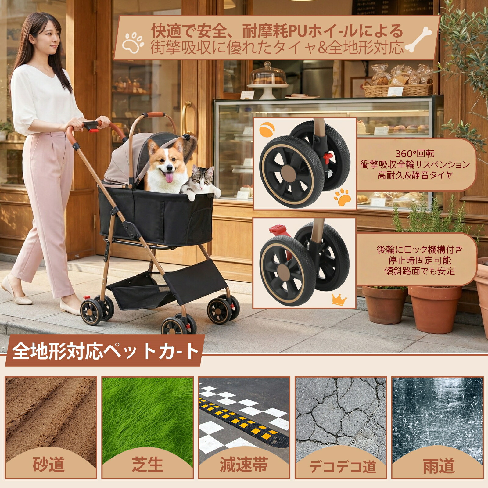 【超高耐久PUラージタイヤ & 超薄ボデー】犬 ベビーカーの高品質PU大型タイヤは、耐摩耗・耐滑加工を施しており、従来のEVA素材に比べて約5倍の長寿命を実現。砂利道、石畳、レンガ路、減速帯、芝生など、様々な路面でも安定した快適な走行を提供します。さらに、超薄型ボディ設計により、電車の改札機など狭い空間も楽々通過可能。前輪は360°回転で小回りが利き、両側後輪には操作性の良いブレーキを装備。ハンドル高さも調節でき、ご身長に合わせて肩や腕の負担を軽減します。