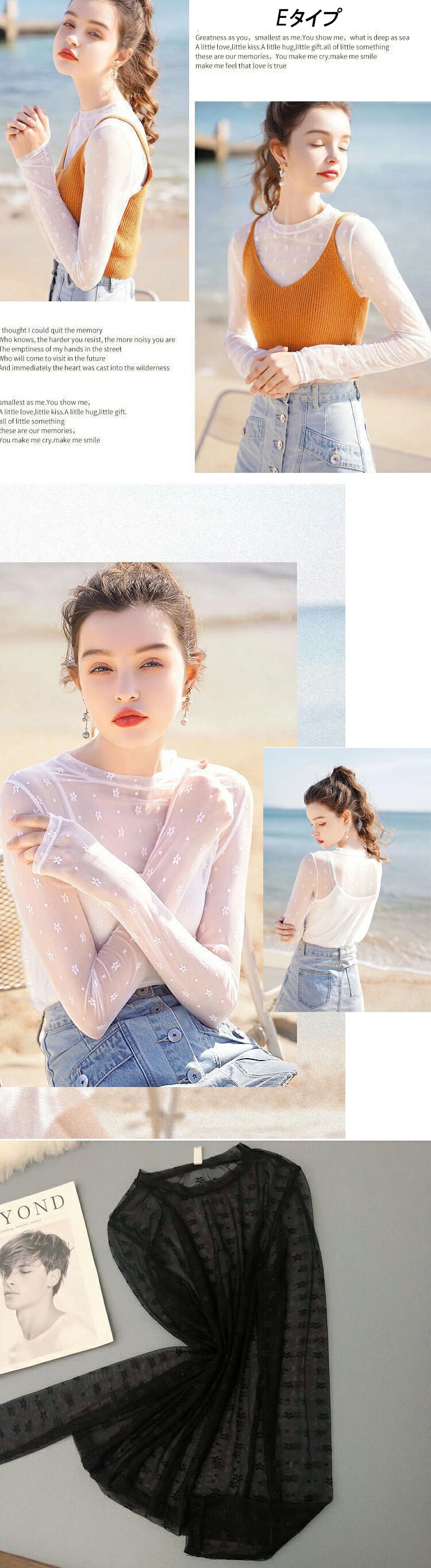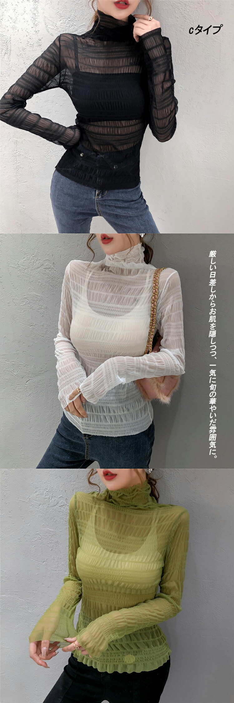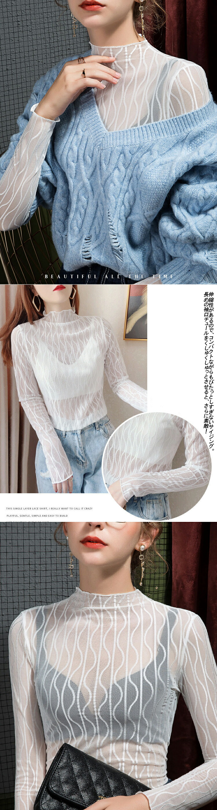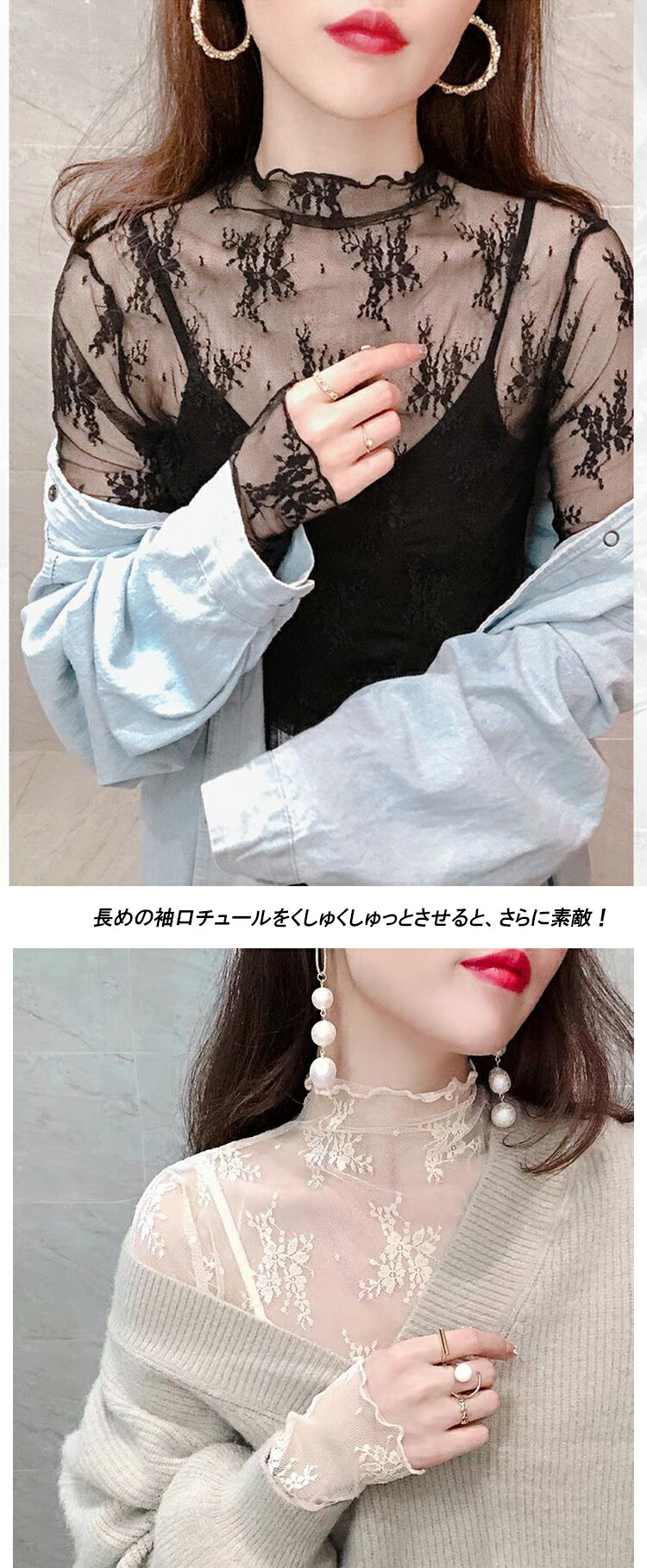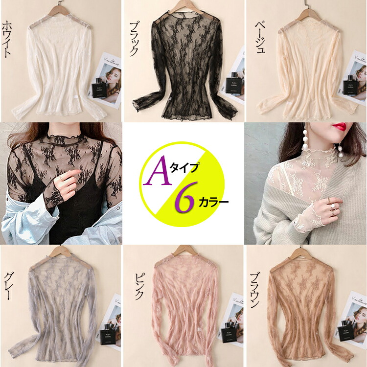 春夏 レディース トップス シアートップス レース チュール シースルートップス 長袖 刺繍 花柄 インナー ハイネック 肌魅せ タートルネック レイヤード UV対策 キレイめ 華やか 透 日焼け対策