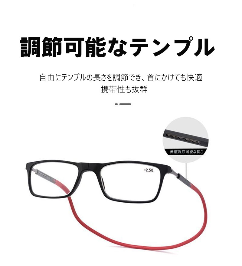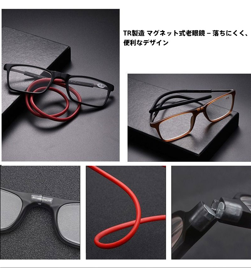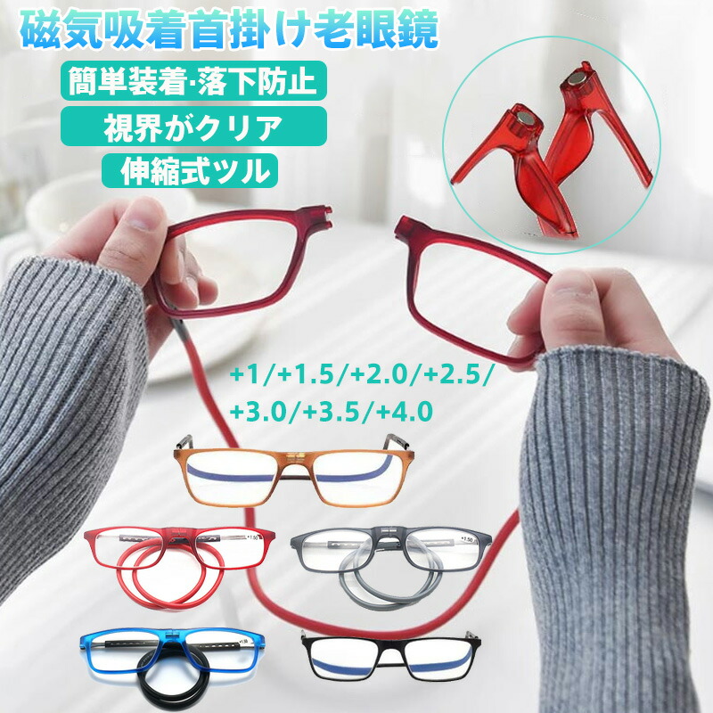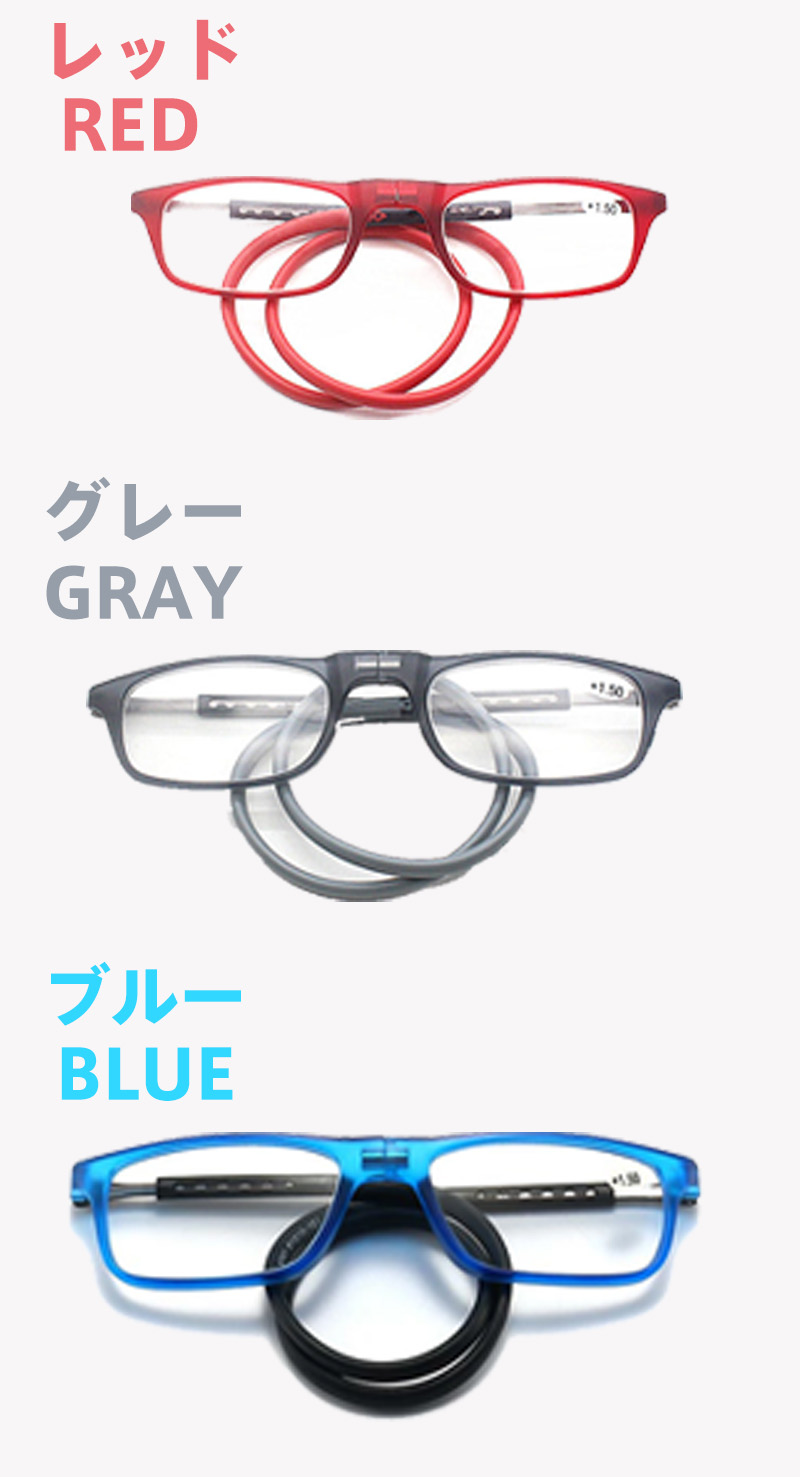 磁気吸着 首かけ老眼鏡 クリックリーダ スポーツ アウトドア 人気 ブラック ブラウン グレー レッド ブルー 100 150 200 250 300 350 400