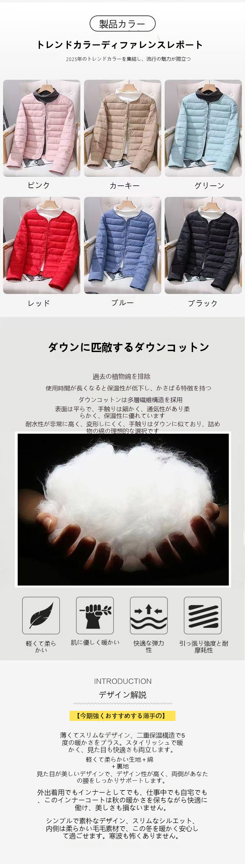 レディース 薄手 インナー ダウンジャ コート ジャケット 豊富 ブラック ホワイト ピンク グリーン レッド ブルー カーキー M(40-50kg) L(50-55kg) XL(55-60kg) 2XL(60-65kg) 3XL(65-72.5kg) 4XL(72.5-77.5kg)