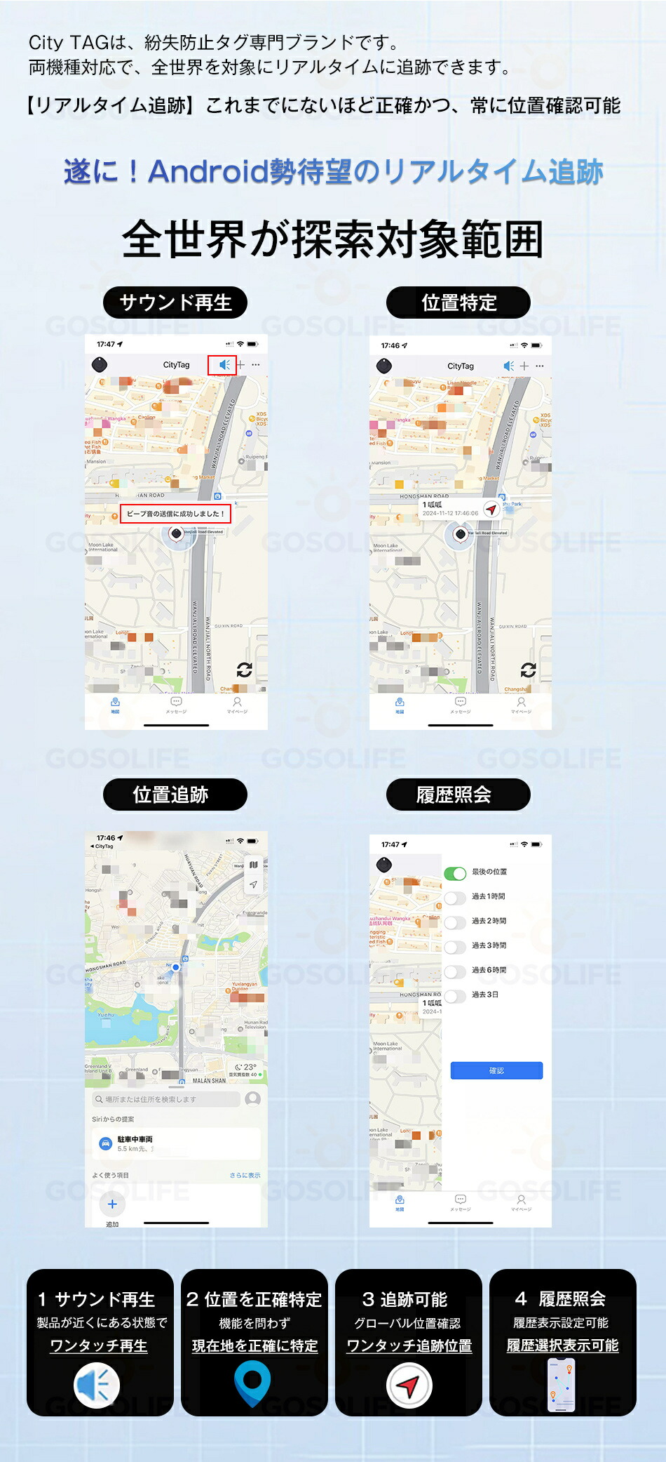 Citytag GPS発信機 Apple&Android共通 月額不要 車追跡 磁気機能 老人 gps 子供 浮気調査 紛失防止タグ 履歴照会バイク自転車 gpsトラッカ 小型