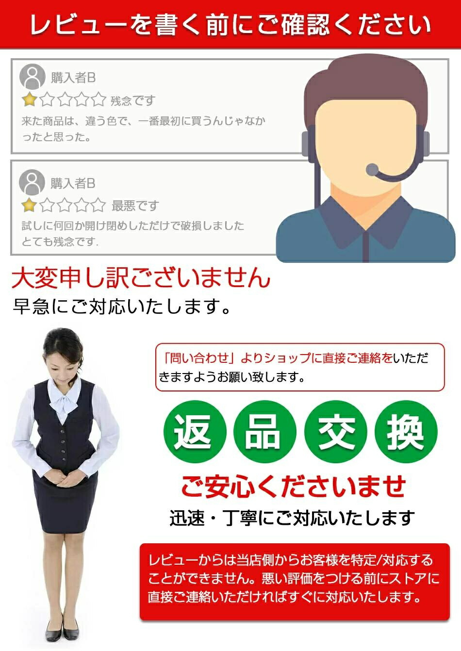 9.こちらの対応と商品について何かご不満がありましたら、「悪い評価」を付ける前に一度当方とご連絡ください。出品者の誠意を持って最後まで対応いたします。