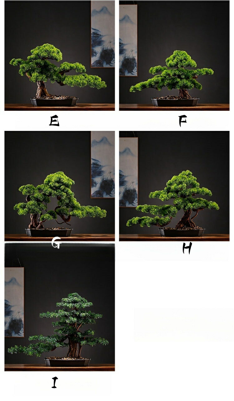 リアルで繊細な人工葉と、天然木の曲がった幹が特徴の美しいフェイク盆栽