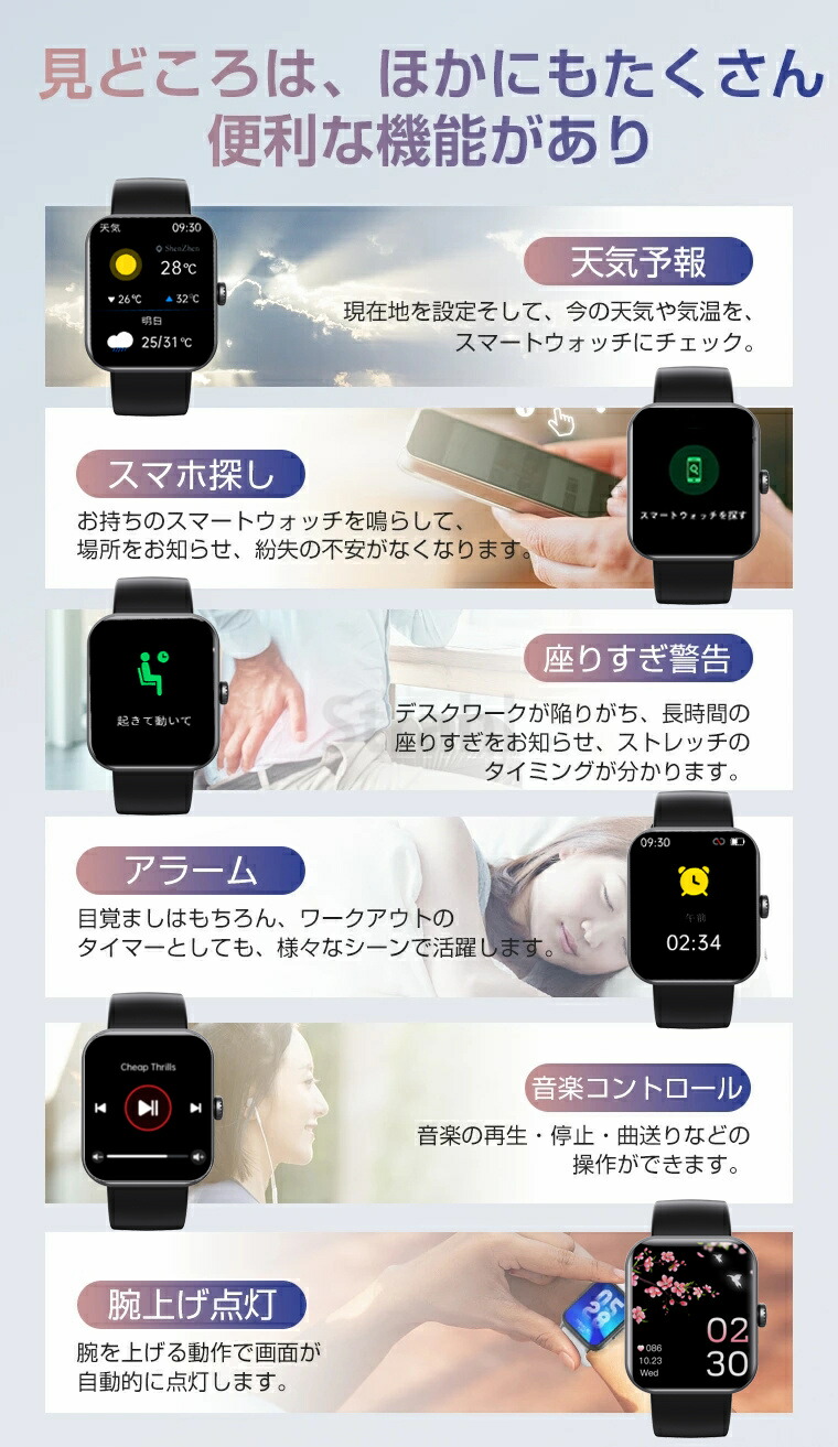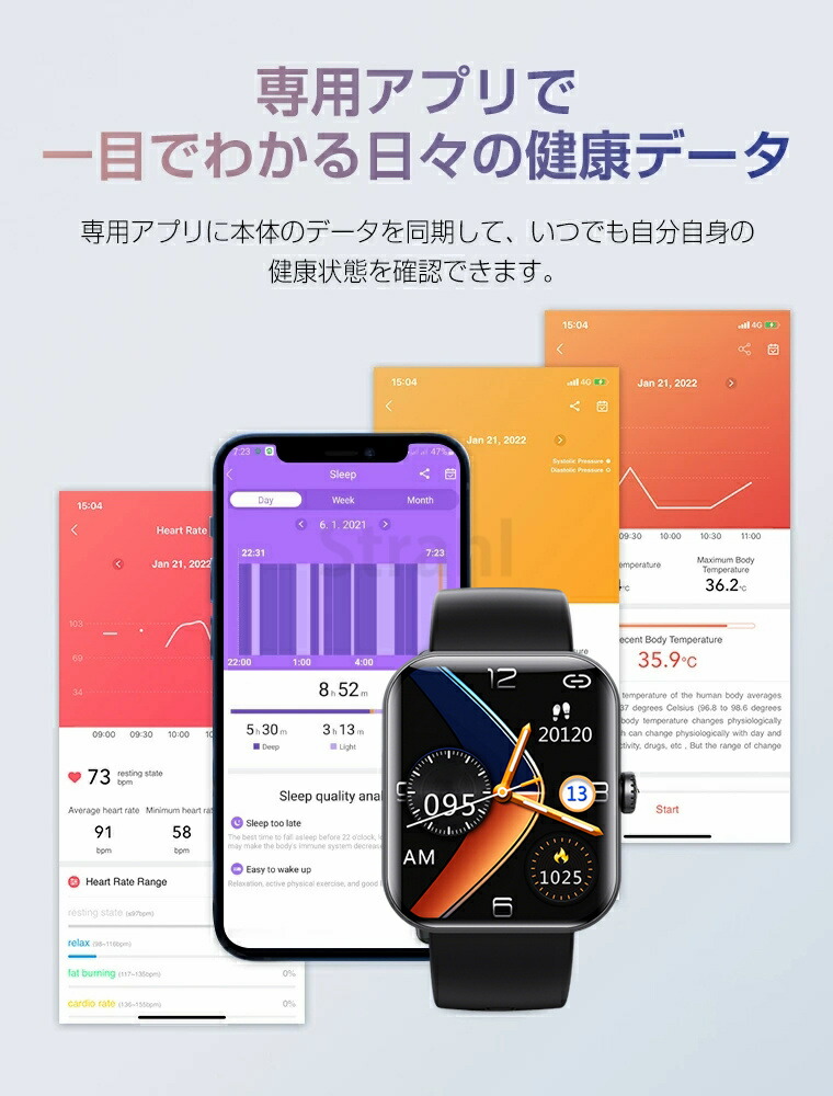 24時間皮膚温変動監視、心拍数、活動量計、歩数、座りがちの自動注意、睡眠、天気予報、着信通知、アラームなど。毎日の健康状況を把握できます。