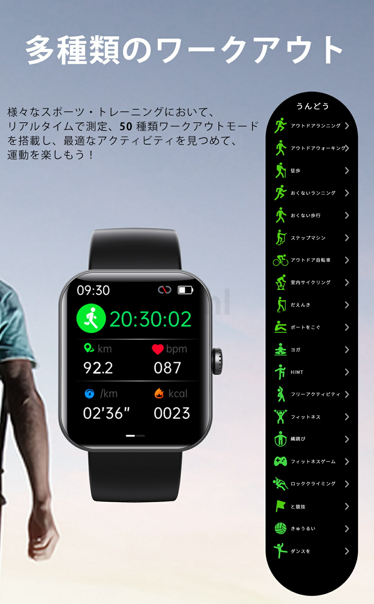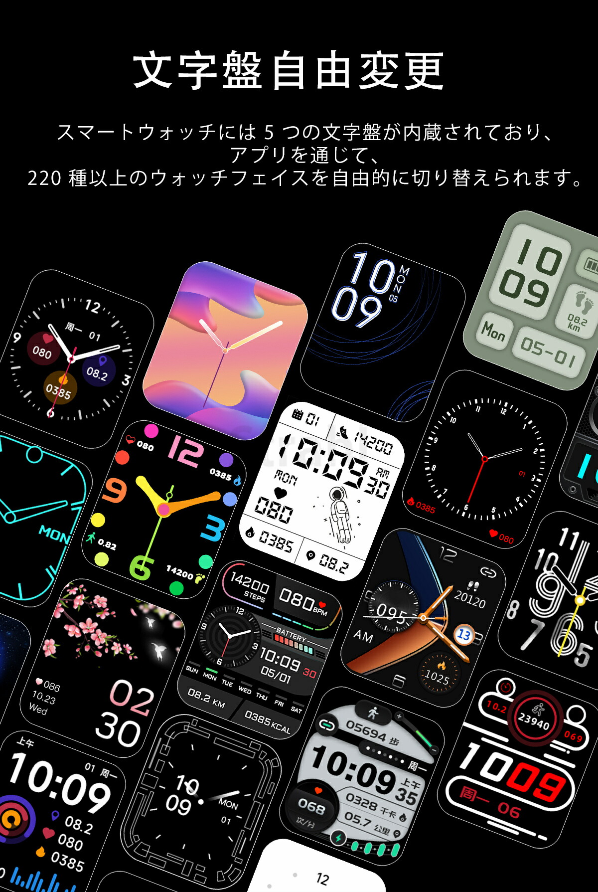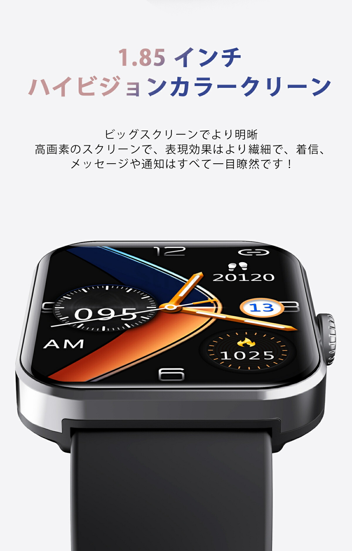 1.91インチのカラー スクリーンを搭載し、時間やメッセージなどの内容がよりり鮮明に表示され、自動輝度調整機能が付き、どんな場所でも見やすいスマートウォッチ。