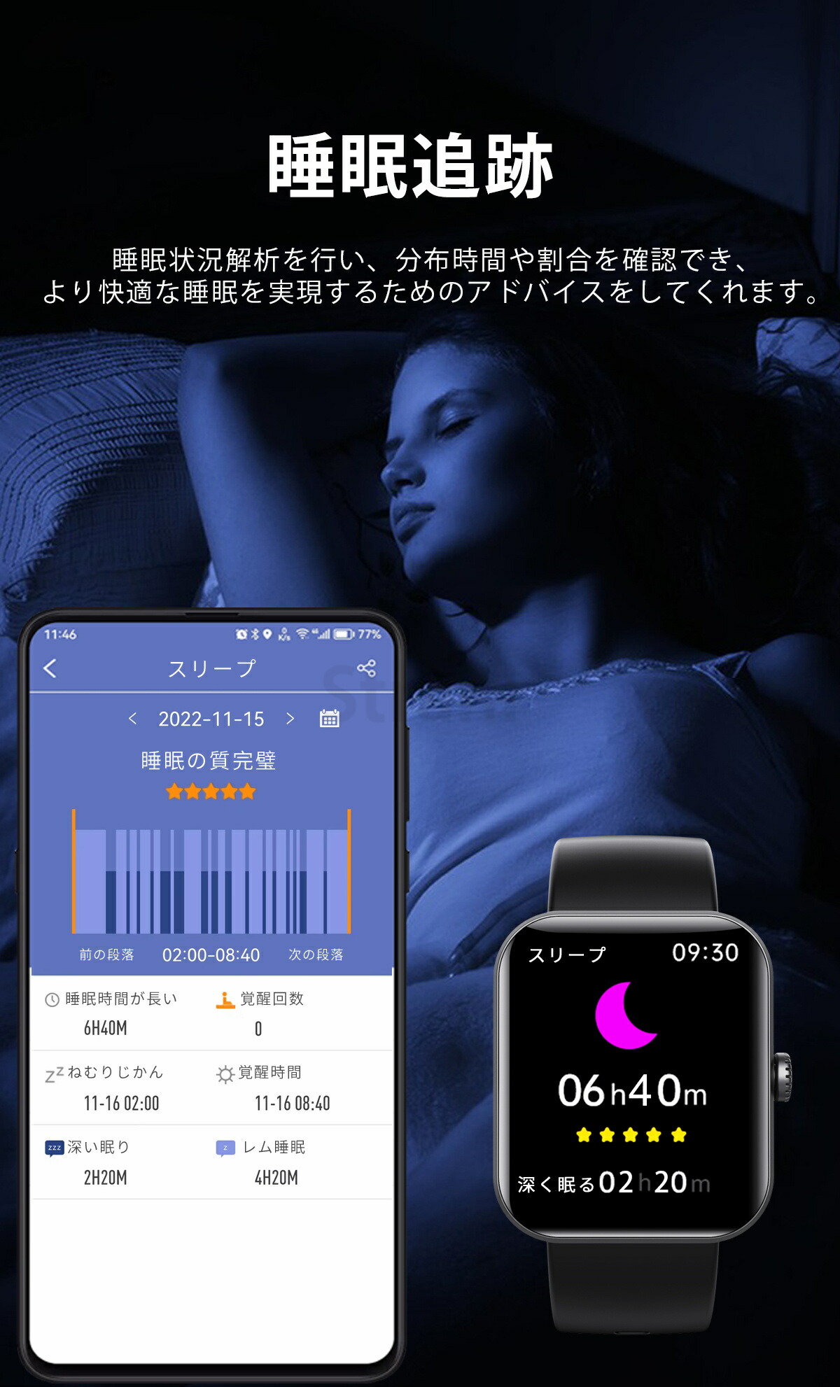本活動量計で歩数、消費カロリー、距離などのデータを記録し、合理的に運動量、運動時間を管理することができます。また、睡眠データを記録でき、睡眠の質を計測可能となり、睡眠パターンの調整に活用できるスマートブレスレット。他にも着信通知、輝度調整、カメラ遠隔、スマホ探す、ストップウォッチ、アラーム、座りすぎ通知、腕上げ点灯などの機能があります。スポーツ性、ファッションと実用性を備え、クリスマス、新年、誕生日、記念日、父の日、母の日、敬老の日などに最適なプレゼントです。