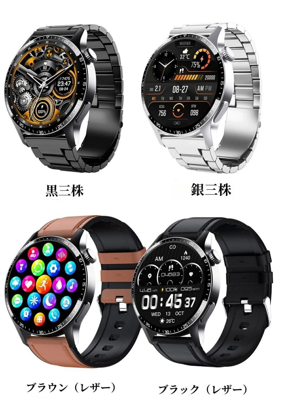 正規品保証 スマートウォッチ 日本製セ 黒三株 銀三株 ブラウン(レザー) ブラック(レザー) シルバー(合金鋼) ブラック(合金鋼) ブラック シルバー 5V1Aスマートウォッチ適用充電器