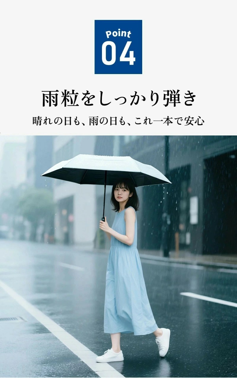 【晴雨兼用&超撥水加工】 急な雨にも対応する晴雨兼用傘。高密度生地に超撥水加工を施しており、水滴をサッと払えてすぐ収納可能。折りたたみ傘としても優秀で、通勤や通学、旅行にも最適です。