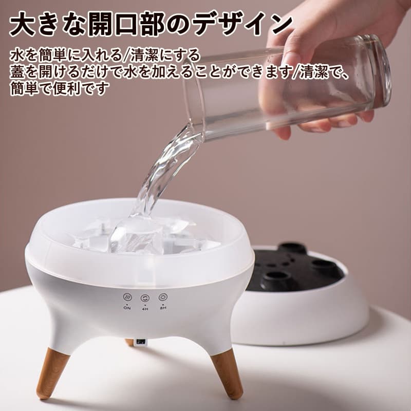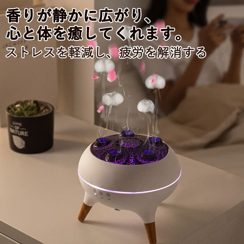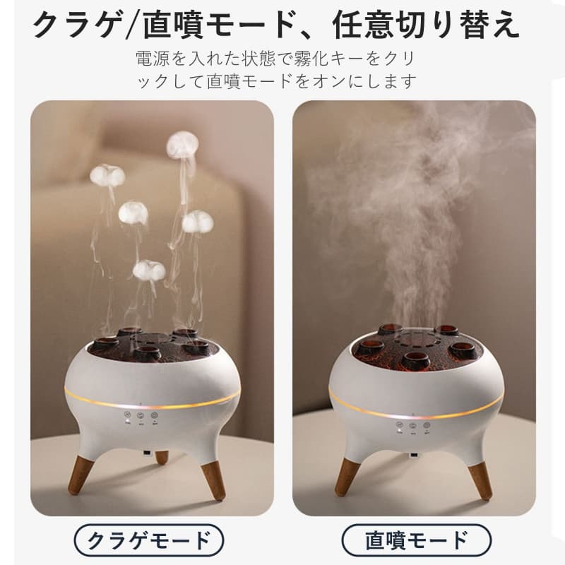 音楽に反応!【踊るアロマ加湿器】【7色LED】お部屋の乾燥対策と癒やしの空間を同時に叶える、新感覚の音声操作対応アロマ加湿器が登場しました。最大の特徴は、音楽のリズムや音声に反応して、煙がクラゲのようにふわふわと踊りだす「クラゲモード」 。まるで水槽の中のクラゲのように優雅に漂うミストは、見ているだけでリラックスでき、SNSでも話題間違いなしの神秘的な光景をお楽しみいただけます。もうひとつの「ストレートミストモード」 では、従来の加湿器のようにしっかりと湿度を補給。ご用途やお気分に合わせて、2種類の噴霧モードをお選びください。本体には7色に変化する優しいLEDライトを内蔵。お部屋が一気にムーディーな空間に早変わりします。就寝時のナイトライトとしてもお使いいただけます。付属のワイヤレスリモコンで、ソファやベッドに寝たままでもらくらく操作可能。大口設計でお水の補充やお手入れも簡単です。水切れ自動オフ機能付きで、安心してお使いいただけます。“見て楽しい”、“使って便利”なこの一品で、あなたの日常に豊かな潤いと安らぎをプラスしてみませんか ポイント:音感応答機能:音楽のビートや声に反応して、ミストの噴射が変化します。2WAY噴霧モード:「躍動するクラゲモード」と「集中加湿のストレートモード」を切り替え。7色変化ムードライトワイヤレスリモコン:離れた位置からでも全ての操作を簡単に行えます。安心設計:水切れ時には自動で電源オフ。大口設計でお手入れ簡単。アロマ対応:お好みの精油を数滴垂せば、お部屋中が心地よい香りに包まれます。