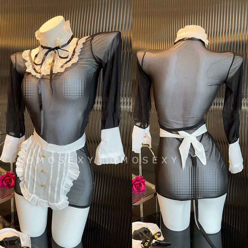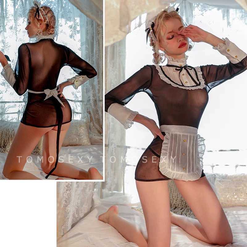 この魅力的なメイド風ランジェリーは、特別な夜を彩るための完璧な選択です。黒い透け感のあるワンピースは、エレガントな花柄レースとデリケートなエプロンが特徴で、洗練されたセクシーさを演出します。長袖デザインが上品な印象を与えつつ、背中には長い尻尾が付いており、遊び心あふれるアクセントを加えています。