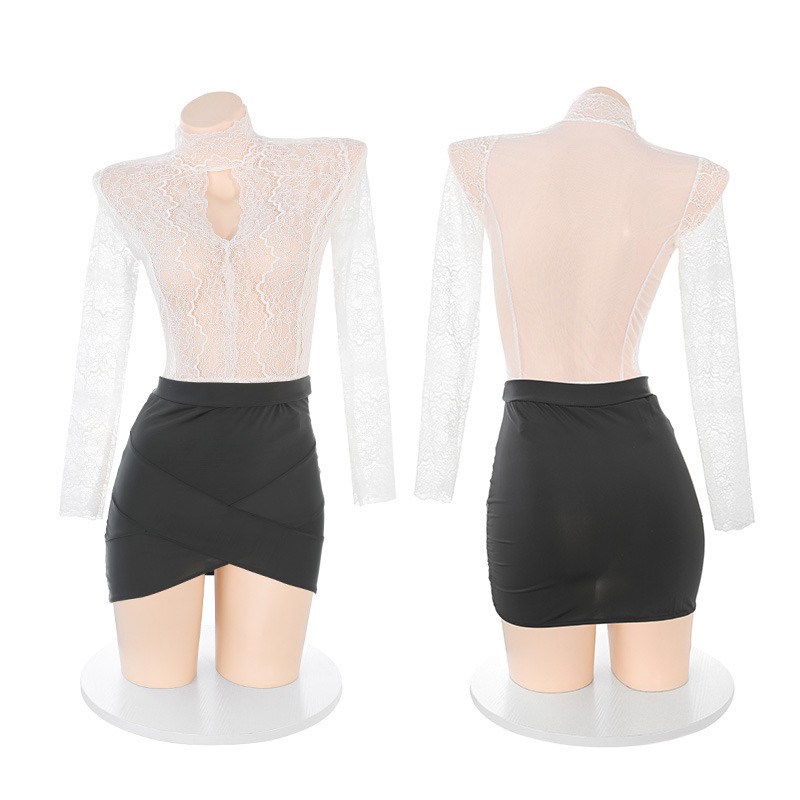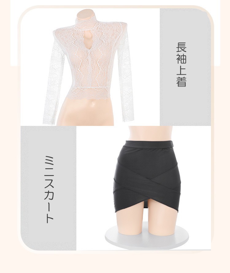 長袖と花柄レースがセクシーさを加えます。タイトなシルエットのミニスカートは、女性らしいラインを強調し、シースルーの素材が適度な透け感を提供します。このコスチュームは、ハロウィンや特別なイベントでの仮装に最適で、オフィスの雰囲気を持ちながらも大胆なスタイルを楽しむことができます。上質な素材を使用しており、着心地も良好です。