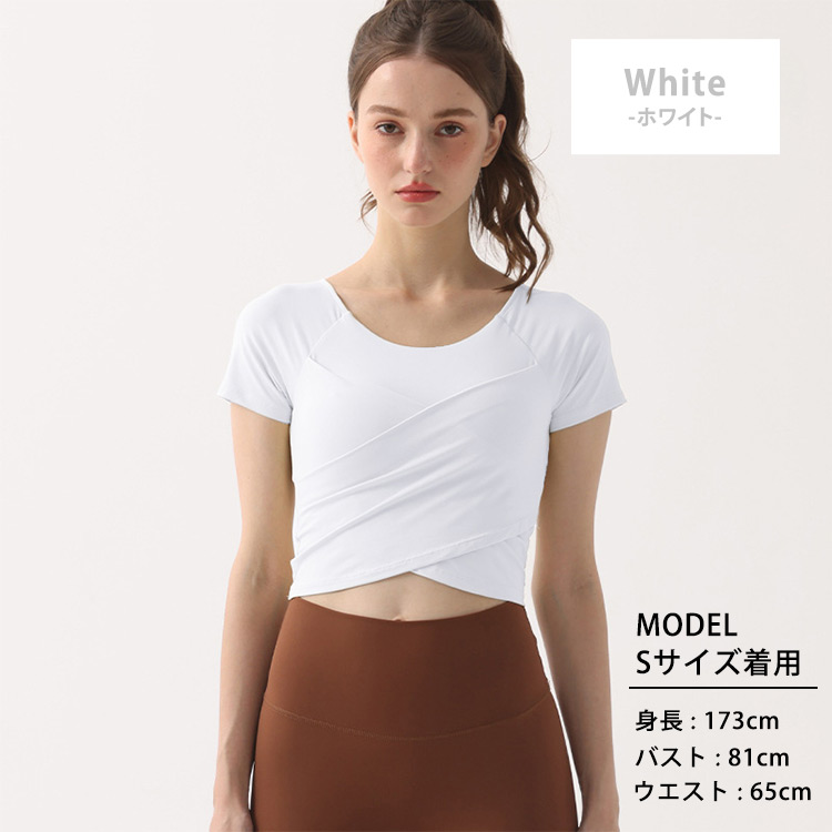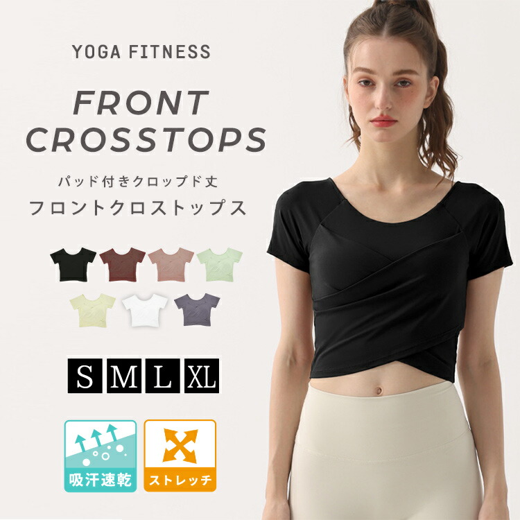 ヨガウェア トップス レディース 半袖 ピラティスウェア クロップド丈 フロント クロス風デザイン Tシャツ カットソー ラグランスリーブ ダンス フィットネスウェア スポーツウェア トレ ジムウェア
