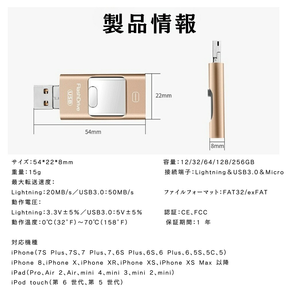 ・最大転送速度:Lightning:20MB/s / USB3.0:50MB/s(高速転送で時間節約)