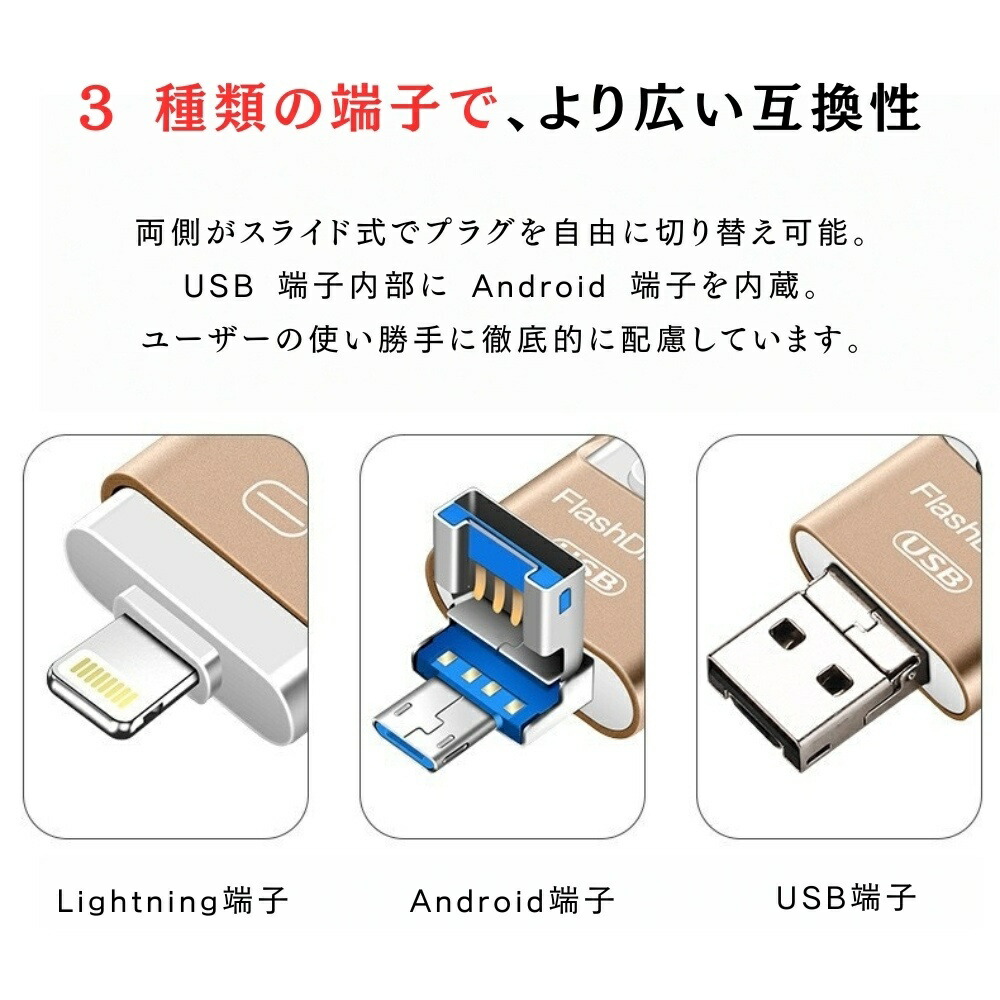 4in1 USB メモリ 金属スライド式 高速データ転送 4 端子対応 Lightning OTG Type-C USB3.0 iPhone Android IOS MAC スマホ データ保存 PC