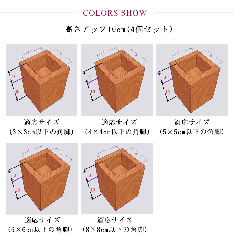 継足 継足し 底上げ 高さ調整 継脚 適応サイズ(3×3cm以下の角脚) 適応サイズ(4×4cm以下の角脚) 適応サイズ(5×5cm以下の角脚) 適応サイズ(6×6cm以下の角脚) 適応サイズ(8×8cm以下の角脚) 高さアップ10cm(4個セット) 高さアップ15cm(4個セット)