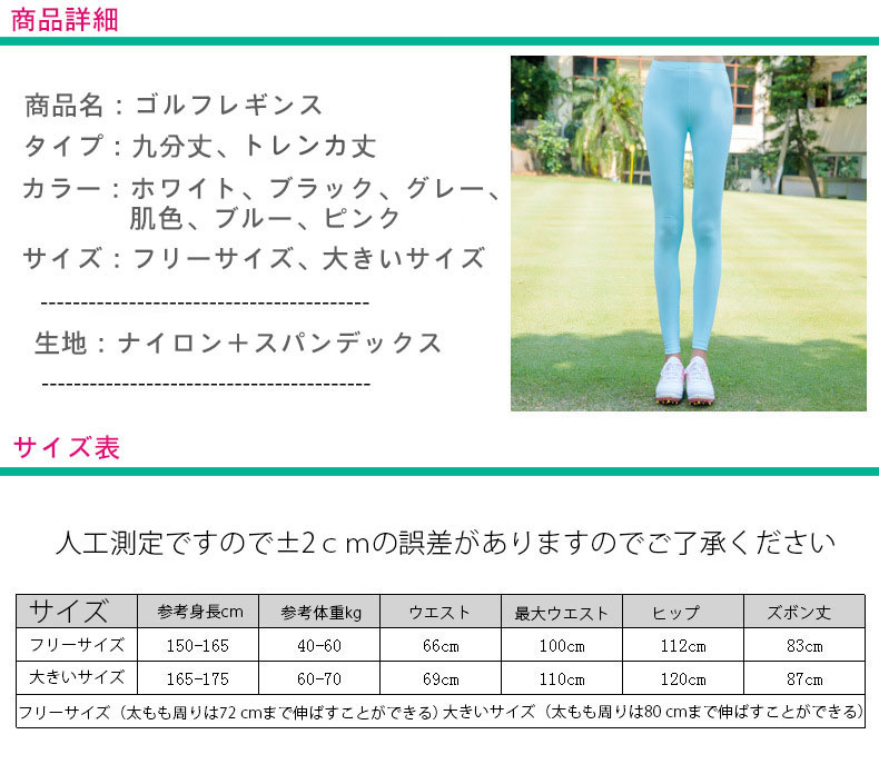 ゴルフ レギンス レディース 日焼け対 スポーツ アウトドア 続々登場 ホワイト九分丈 ブラック九分丈 グレー九分丈 肌色九分丈 ピンク九分丈 ブルー九分丈 ホワイトトレンカ ブラックトレンカ グレートレンカ 肌色トレンカ ピンクトレンカ ブルートレンカ フリーサイズ 大きいサイズ
