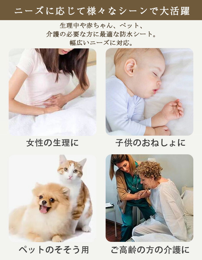 生理中の使用、赤ちゃんやペットのいる家庭、介護が必要な方にも最適な防水シートです。幅広い用途に対応し、家族全員でお使いいただけます。