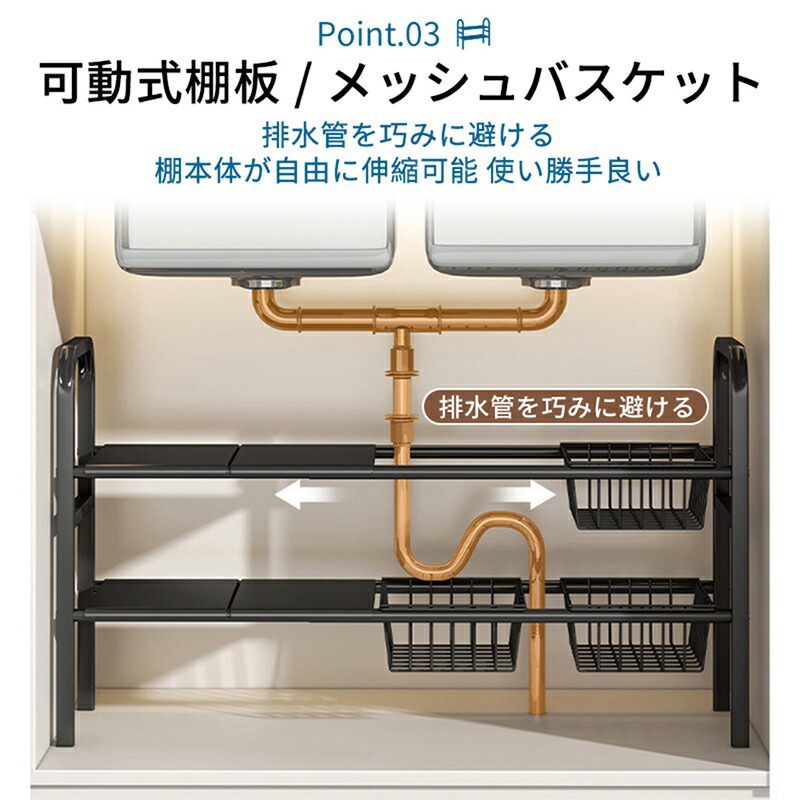 【パイプを避け、スペースを最大限に活用】「収納スペースが足りない」「排水管が邪魔で置けない」…そんな悩みを解決!排水管や段差などの障害物を柔軟に避けられる可動式棚とバスケット付きで、デッドスペースを有効活用。上下2段構造で収納力がアップし、調味料や洗剤、ストック品などをスッキリ分類・整頓できます。