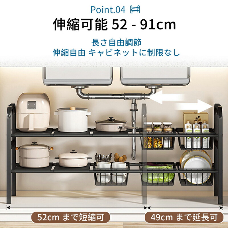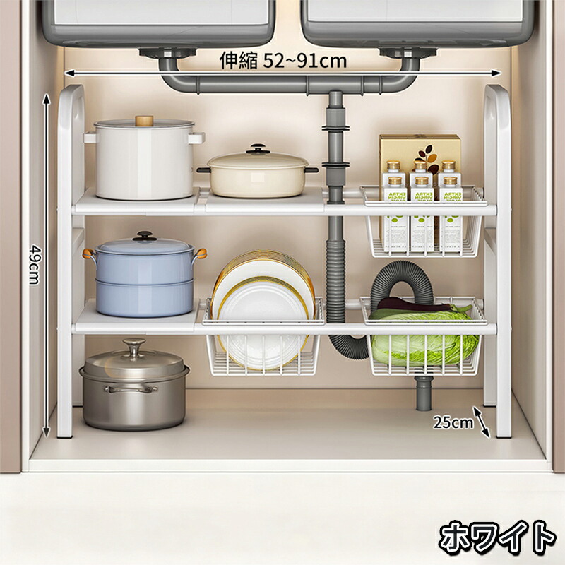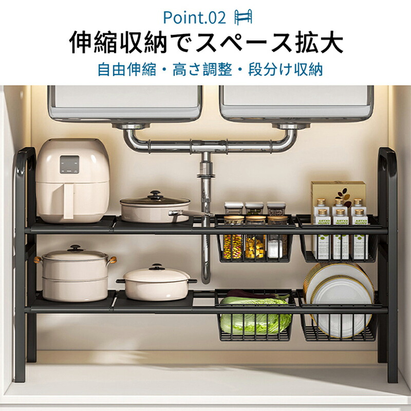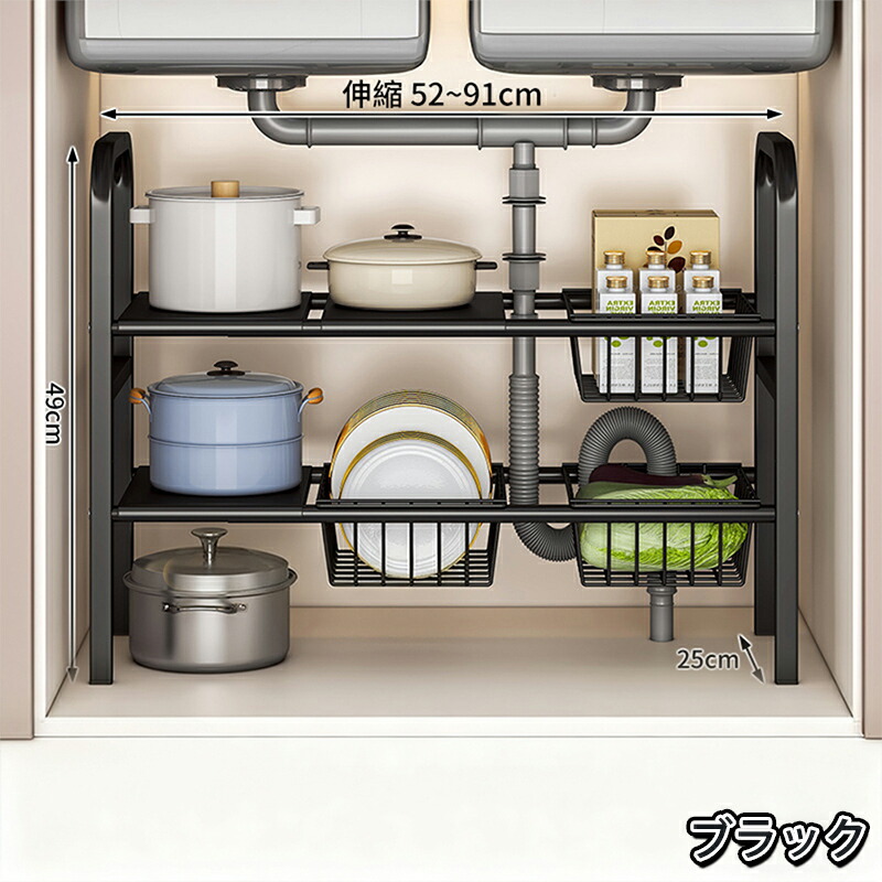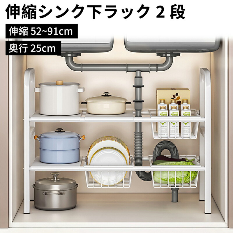 伸縮シンク下ラック 2段 シンク下 収納おしゃれ 便利 ホワイト ブラック奥行25cm おしゃれ 調味料 洗面台 収納 伸縮 ラック シンク収納 キッチンラック 食品庫 調理器具 鍋 食品