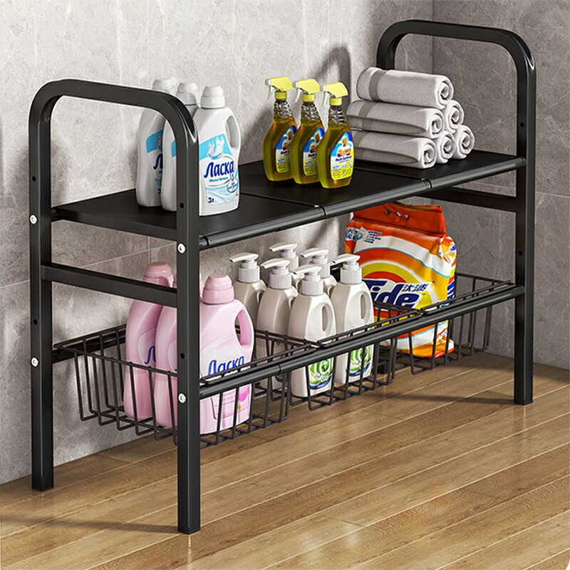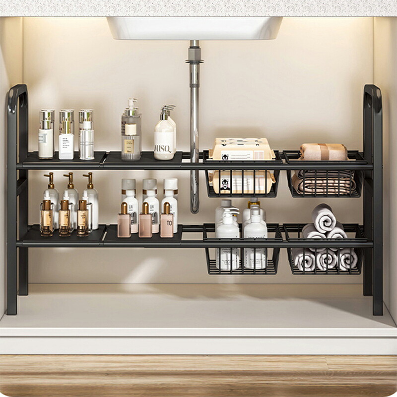 【大容量&高さ調節可能】棚の高さは5cm間隔で調整可能、幅も約53~88cmの間で自由に伸縮できる設計。排水管や障害物を避けながら、2段構造+棚板+収納バスケットで収納力が大幅にアップ。ボトル類や鍋、高さのある洗剤などもすっきり収まり、キッチンや洗面台下のデッドスペースを無駄なく活用できます。棚板とバスケットは取り外し可能&独立設計なので、レイアウトも自由自在。