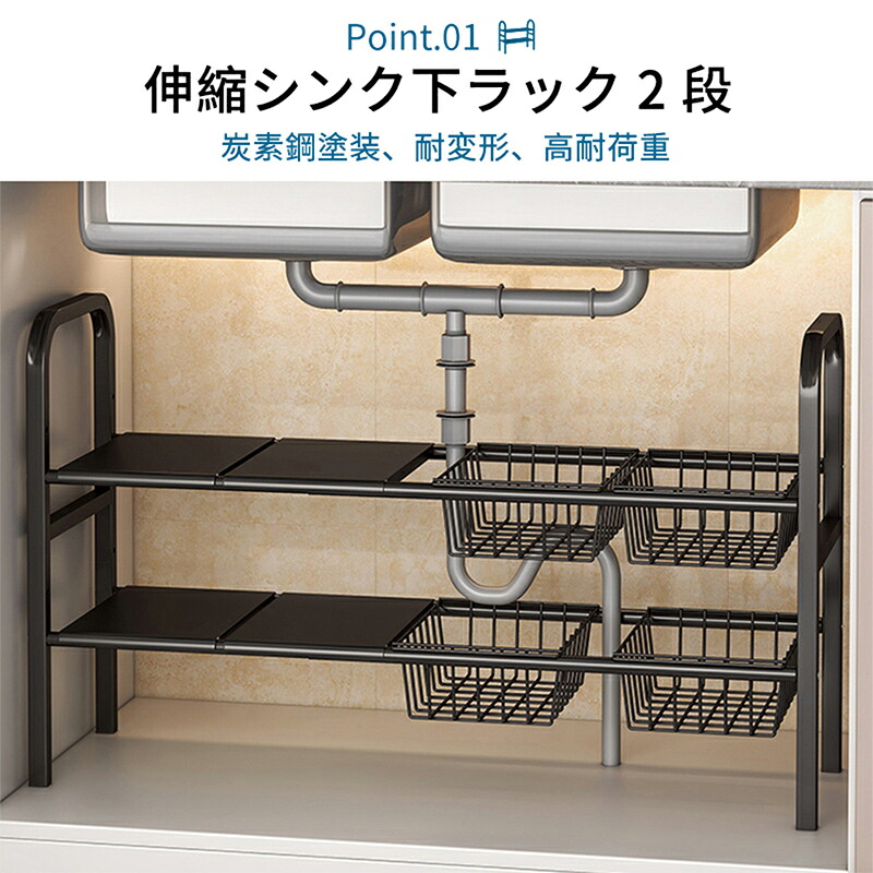 伸縮シンク下ラック 2段 シンク下 収 キッチン用品 食器 調理器具 豊富な品揃え ブラック ホワイト
