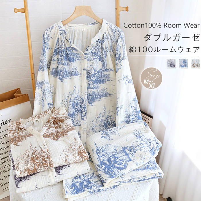 綿100 ルームウェア 2点セット パ インナー 下着 ナイトウエア 人気 ブラウン ブルー パープル M L XL