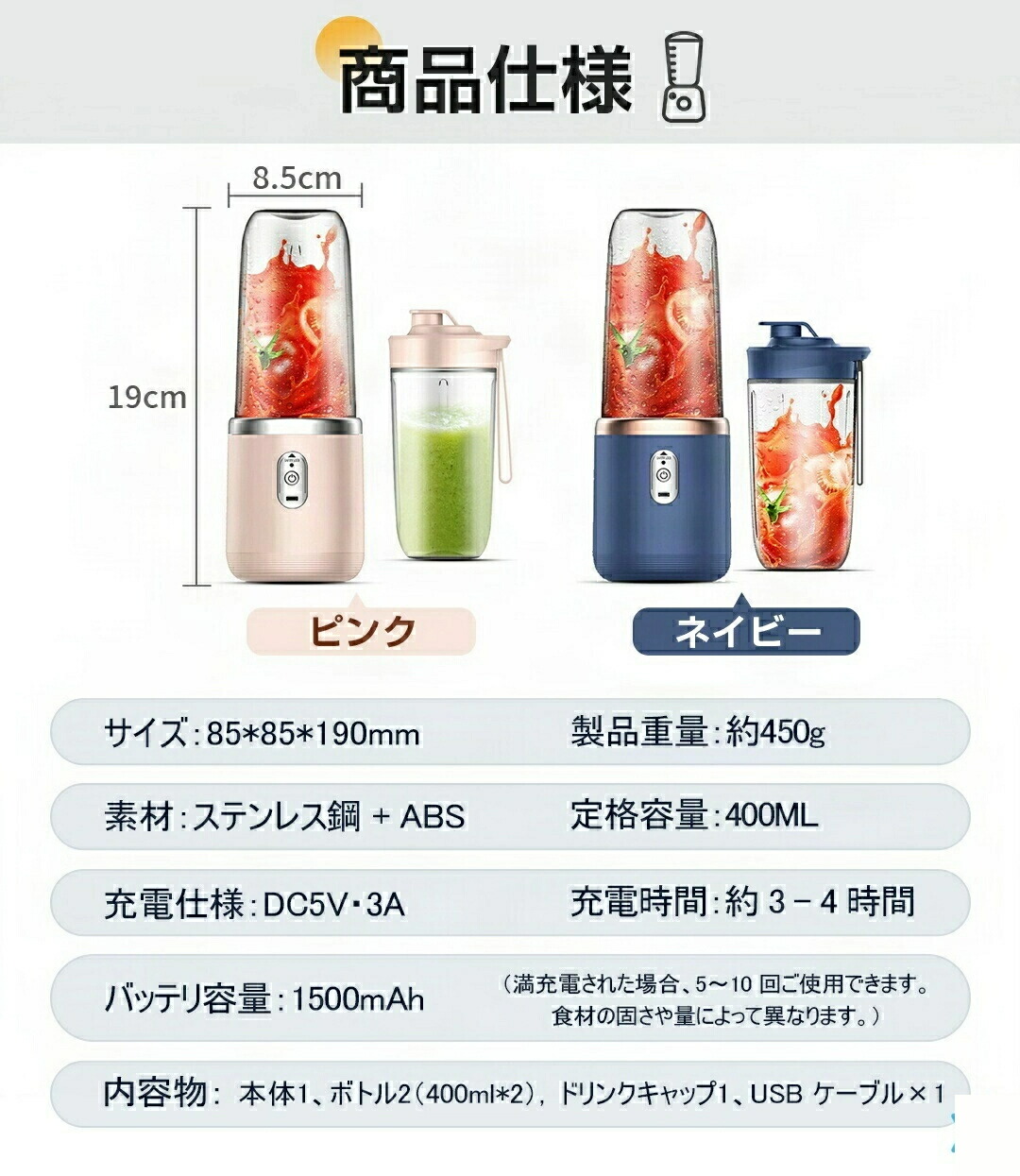 本体1、ボトル2(400ml*2),ドリンクキャップ1、USB ケーブル ×1