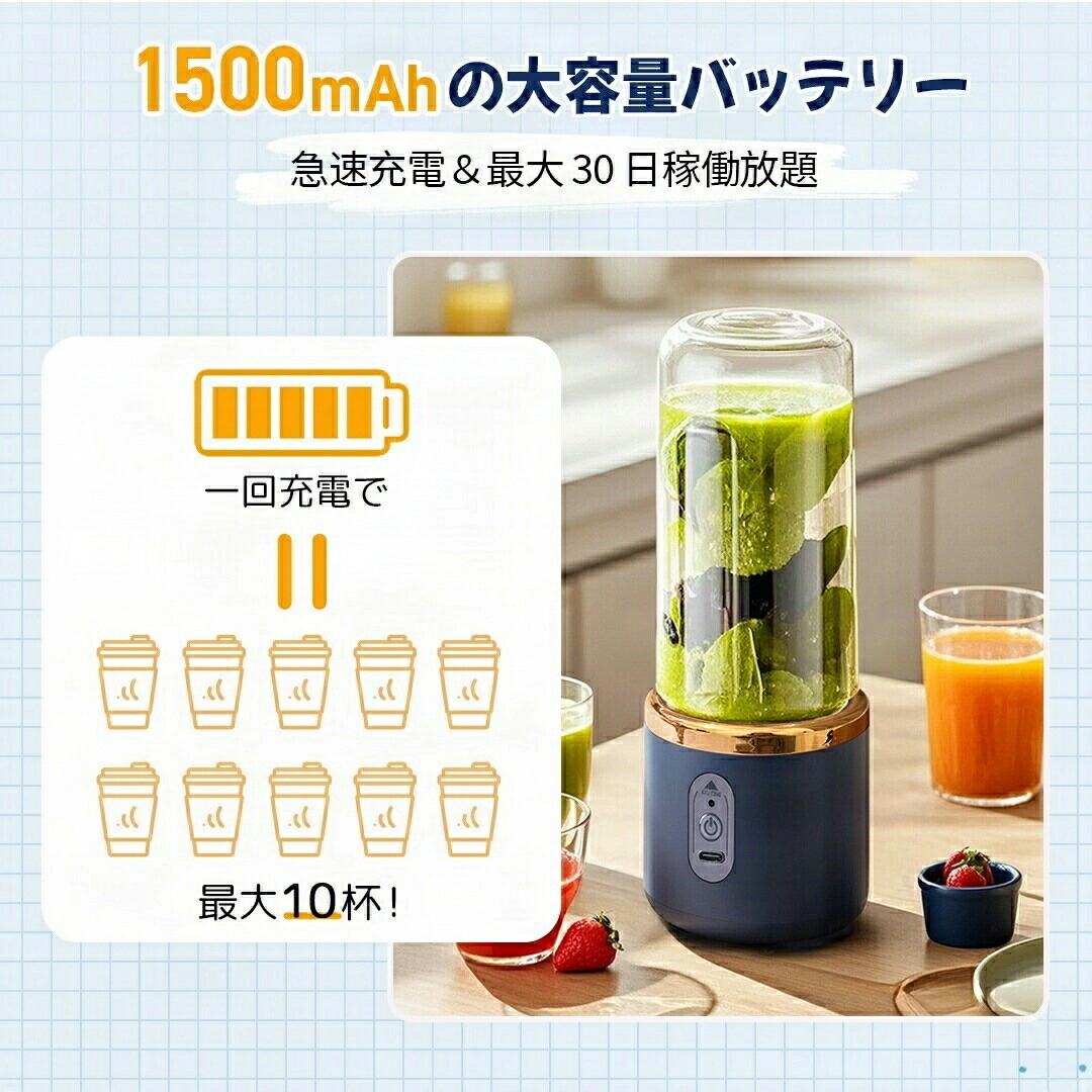 ミキサー 氷も砕ける 6枚刃 スムージー 軽量 1台多役 ジューサー 丸洗い可 携帯ジューサー ハンドミキサー 小型 洗いやすい USB充電式 ブレンダー 氷OK お手入れ 持ち運び便利