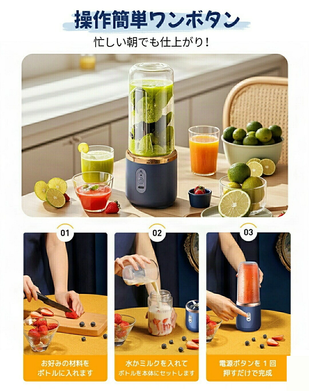 ミキサーの操作は簡単です。ワンタッチ操作で使用できます。食材を入れて、起動ボタンを押すだけで新鮮なジュースが作れます。また、従来のコードレス充電方式ではなく、TYPE-C の USB ケーブルで 3~4 時間の充電が可能で、家庭用、アウトドア、キャンプ、旅行、出張、オフィスなど様々な場所で思い通りの新鮮なジュースを楽しむことができます。