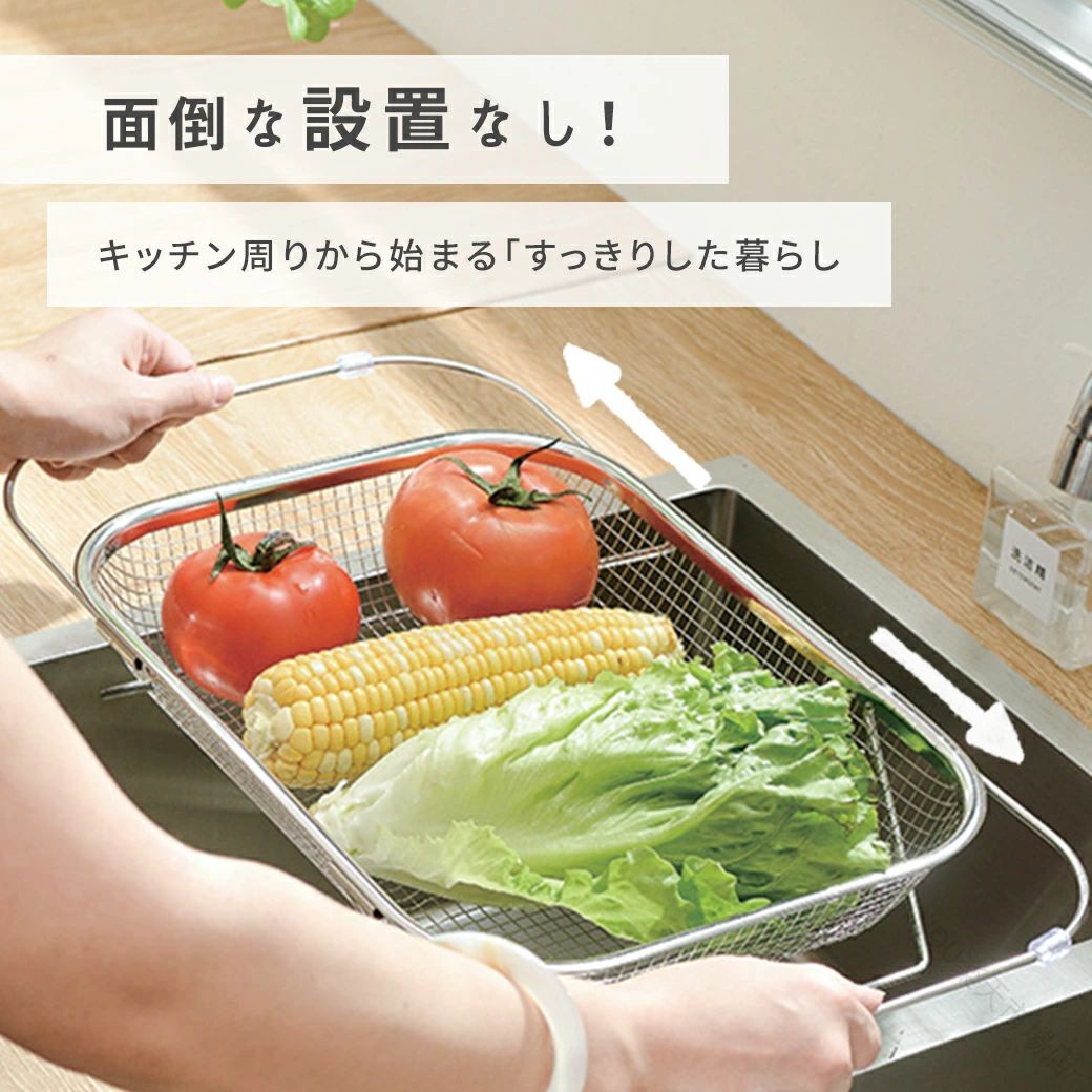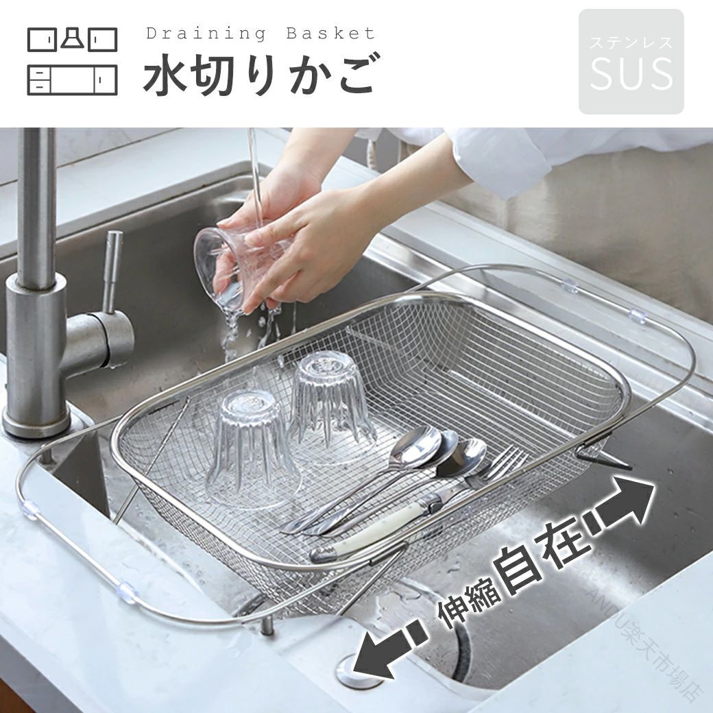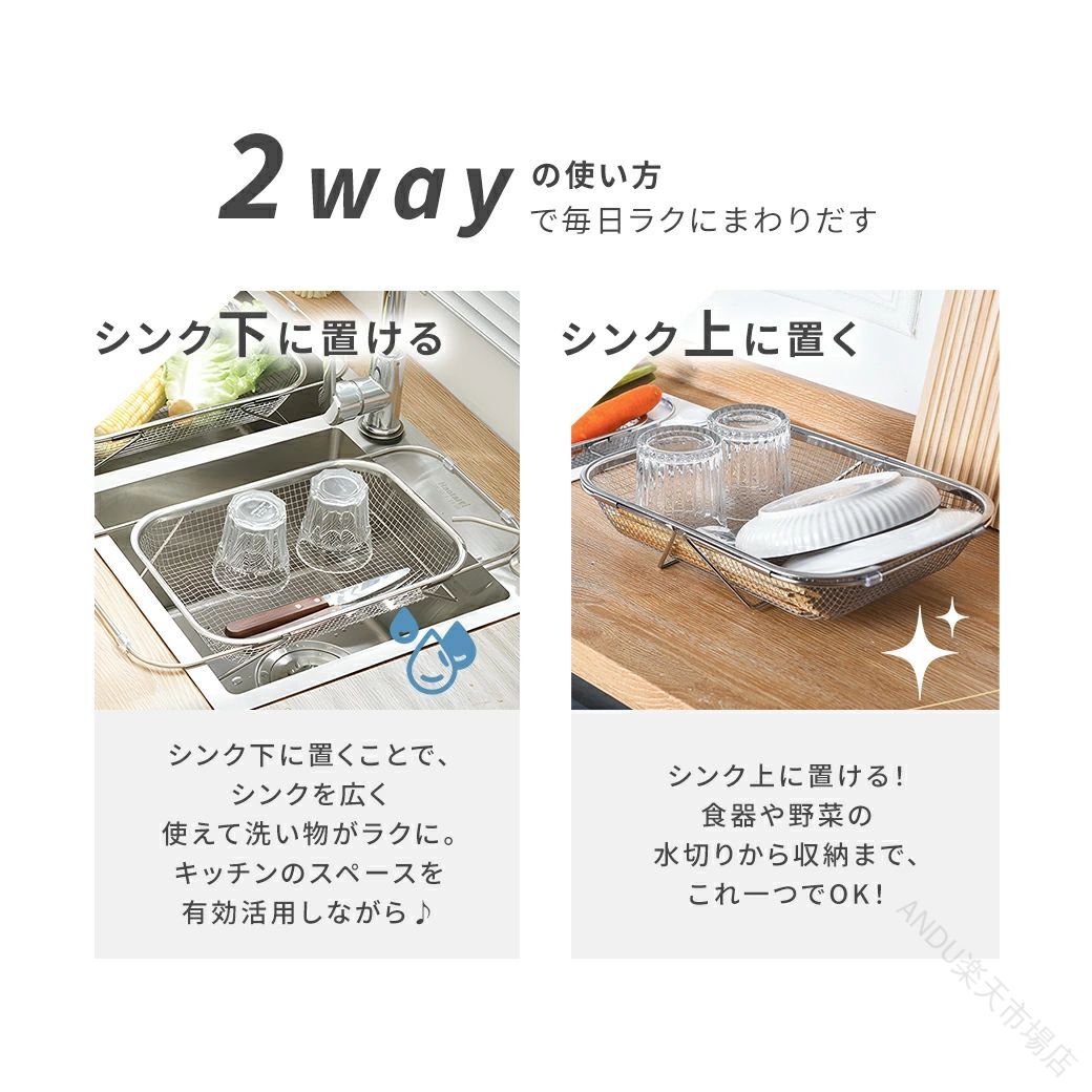 .ステンレス製の伸縮 水切りかご は シンク上 に設置可能で 横置き と 縦置き 両方対応の 大容量 ラック です。食洗機対応 で 水が流れる 設計により 衛生的 に洗い物を乾かせます。キッチンの省スペース化 にも最適な 水切りラック です。。