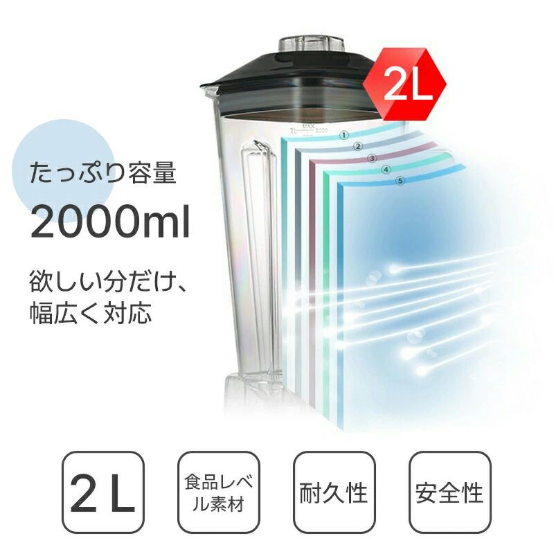 食材をつなぐ素材はすべてBPAフリーです。2Lの容器は、クリームやフローズンドリンク、スムージーなどを大量に作るのに適しており、家庭でも業務用でも使うことができます。