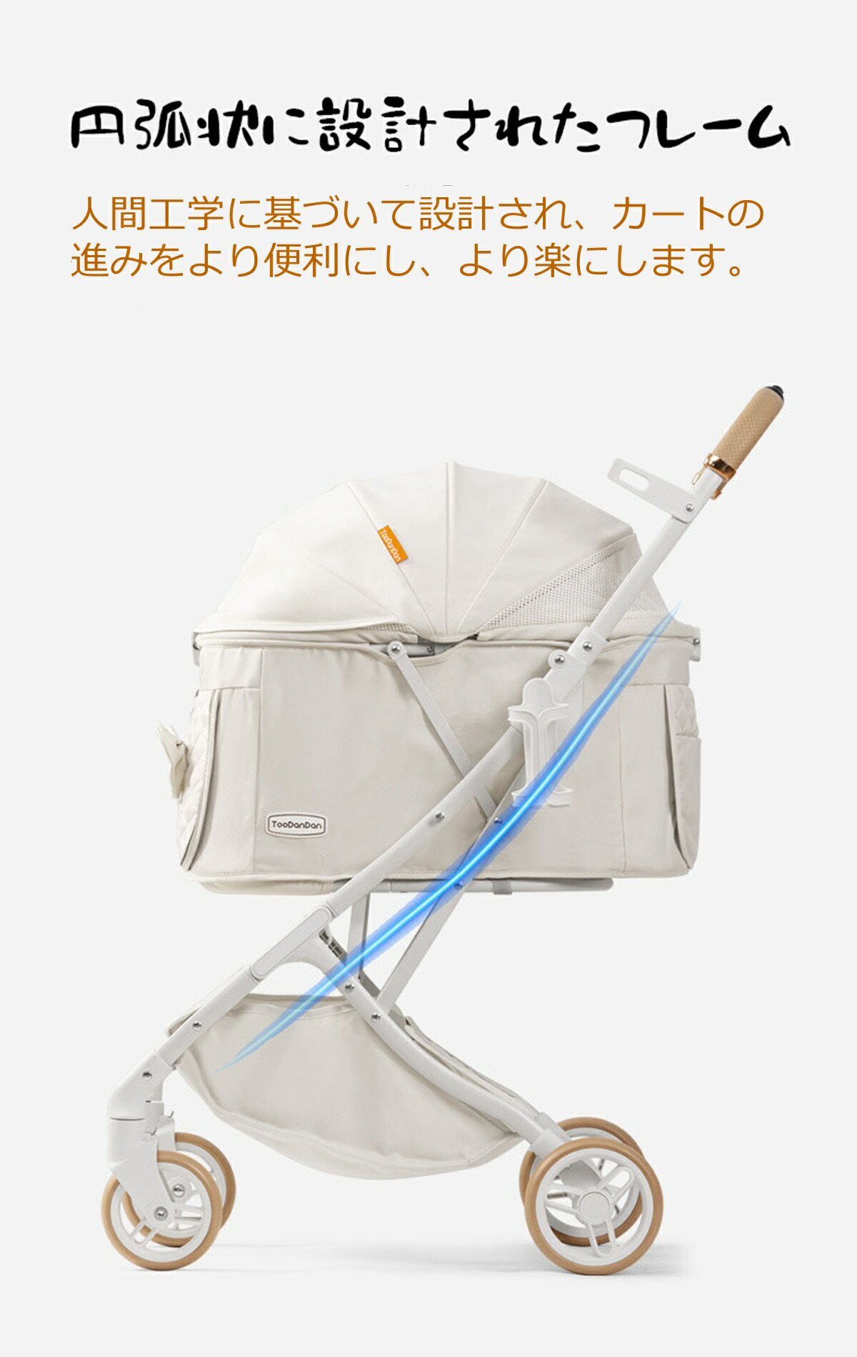 【安定性抜群】折り畳みペットカートの車輪は路面からの振動を軽減するように大き目の車輪を採用しており、まだ振動を吸収するに適したEVA耐摩耗性タイヤを使用しておりますので乗車中のペットにやさしいです。 ドッグカートの前輪は360°回転することができ、精密ベアリングが付き、車輪がスムーズに動きできます。 使いやすい後輪フットブレーキでカートを止める時も安心です。