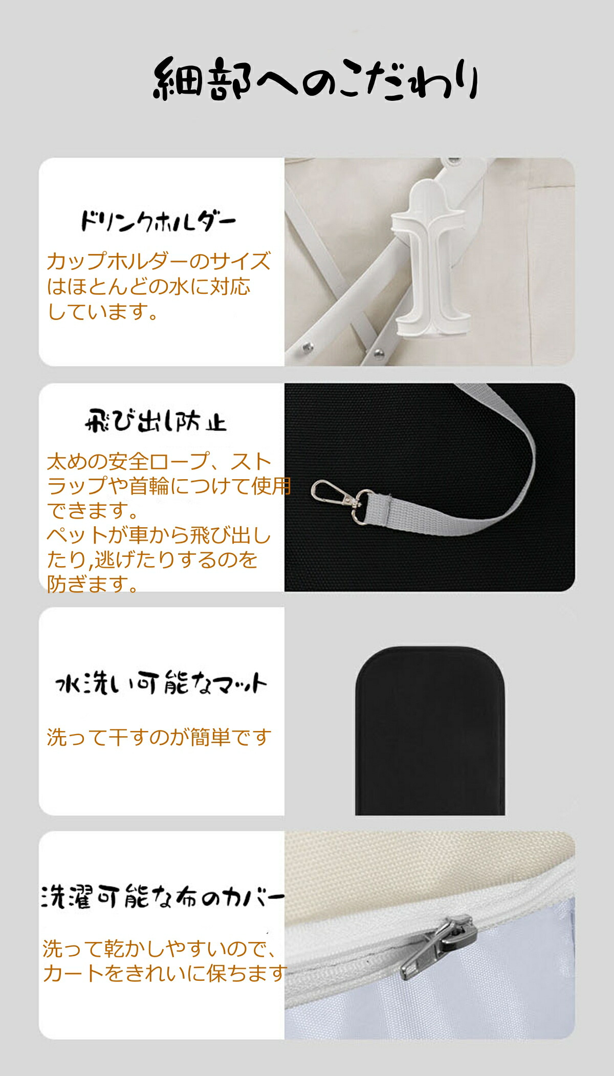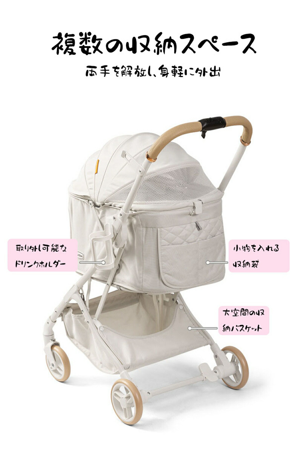 【お出かけ便利】ワンボタンでボタンを押せば、家にいても外出しても使わないときは簡単に折り畳んで収納できます。 軽量設計なので1人でも持ち運びやすい、とても便利です。 コンパクトだから、玄関や車のトランクなどの狭い空間にも保管できます。 犬用ベビーカーのハンドル部分にはドリンクホルダーと小物入れ付き!下のカゴに荷物も入りできます。 マットレスを取り外せて丸洗いできますので、抜け毛やにおいが残りがちなキャリーをいつも清潔に保てます。 それにバスケットの左右どちらからでも開閉でき、最大180度開口部が大きく開くので、ペットの乗り降りスムーズに、ケアもやすくなります。