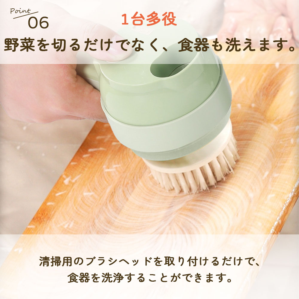 野菜を切るだけでなく、食器も洗えます。清掃用のブラシヘッドを取り付けるだけで、食器を洗浄することができます。