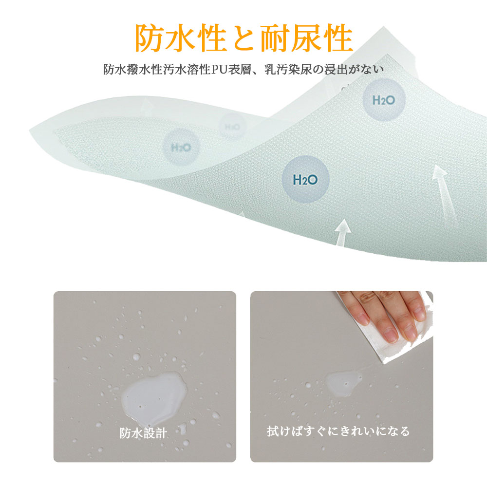 表面は柔らかな水溶性PU素材とコア(プレス)技術により作られており、生地は接着剤などの有機溶剤を使用していないので、赤ちゃんが噛んだり舐めたりしても大丈夫。また、ハイテクノロジー・コーティング技術を使用しており、色柄の褪色がしにくいのも特徴です。
