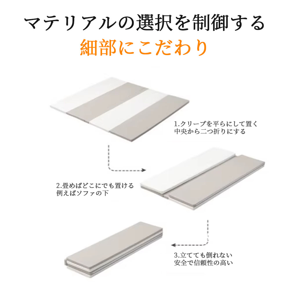 【4つ折りシームレス仕様】マットの継ぎ目の溝が床面になり、表面にすき間(溝)がないので、食べ物や飲み物をこぼしても溝に溜まることなく衛生的です。また、すき間に赤ちゃんの足や手がはさまる心配もなく、安全性も従来品よりも向上しました。