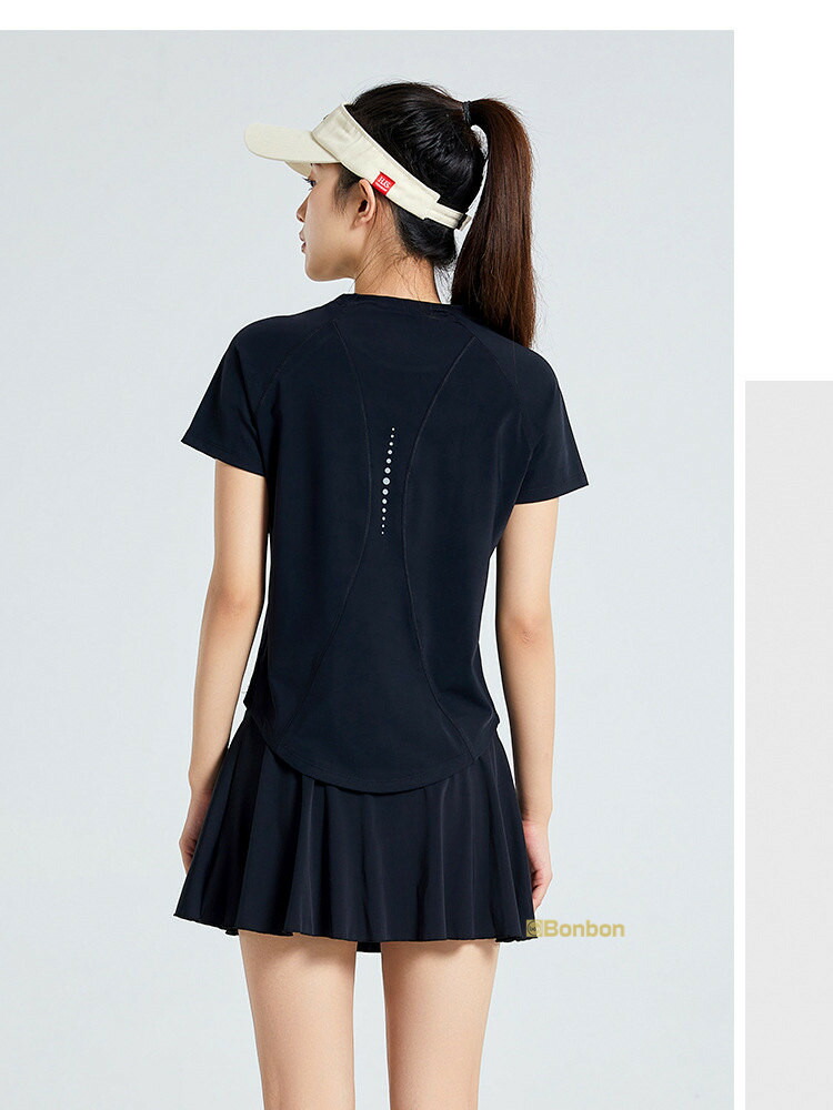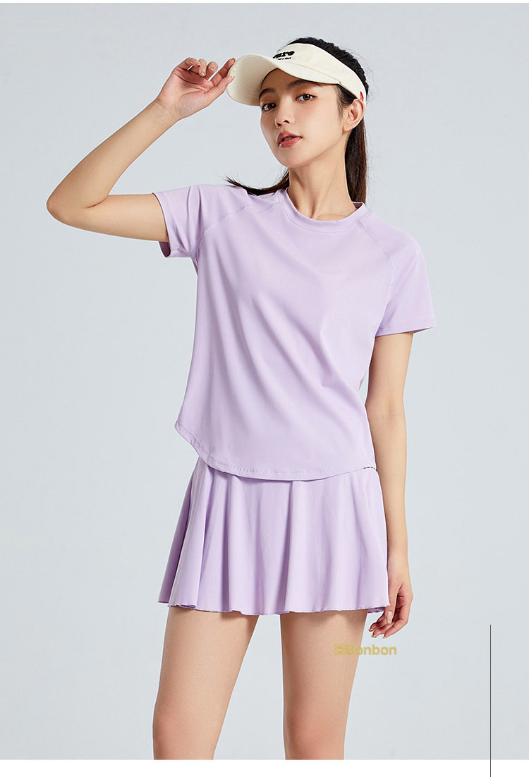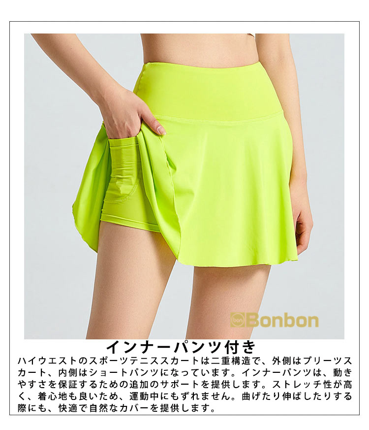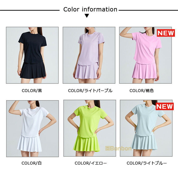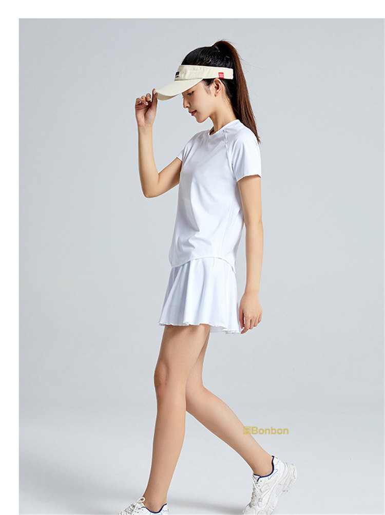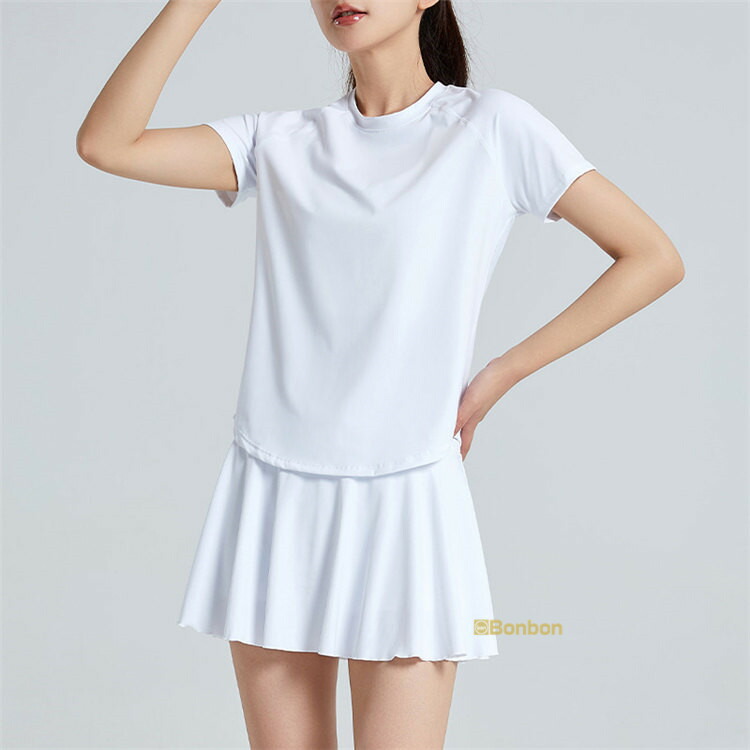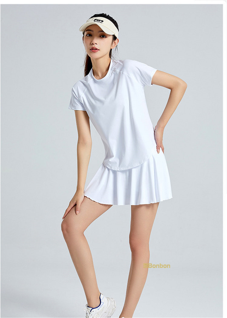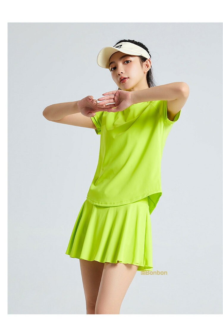 この夏に大活躍のテニスウェア上下セットが登場!テニスはもちろん、ゴルフやランニング、ウォーキング、フィットネス、ヨガなど、様々なスポーツシーンで活躍します。半袖Tシャツとスカートの組み合わせは、動きやすさとスタイルを兼ね備え、インナーパンツ付きで安心して運動に集中できます。