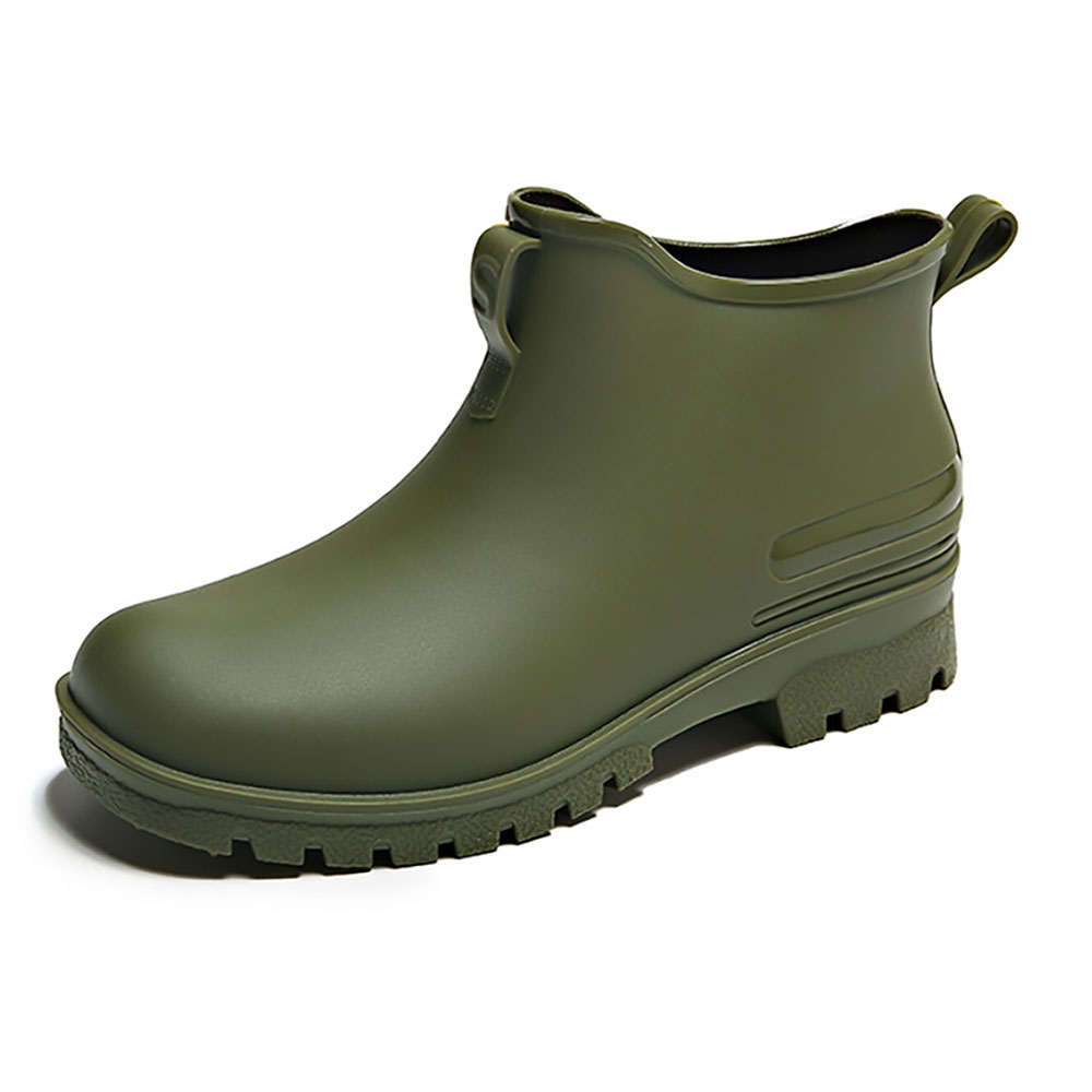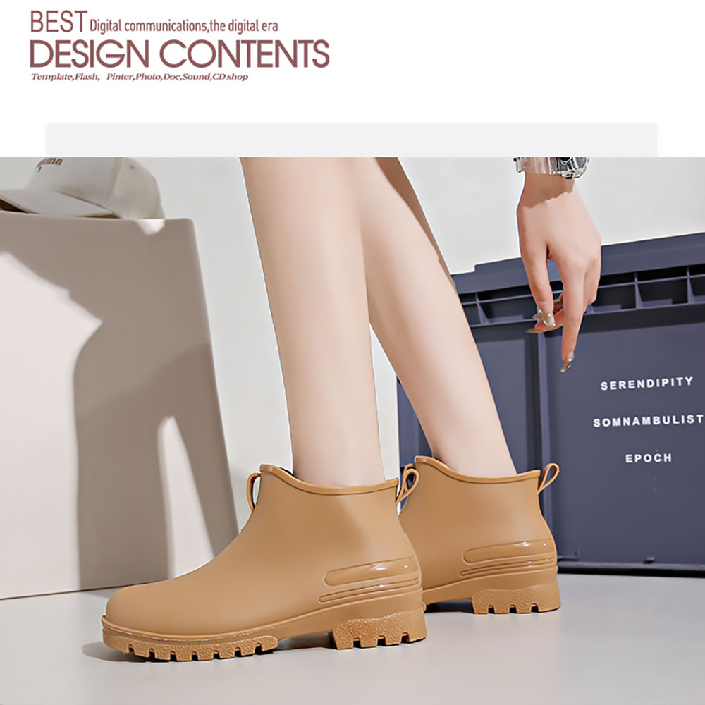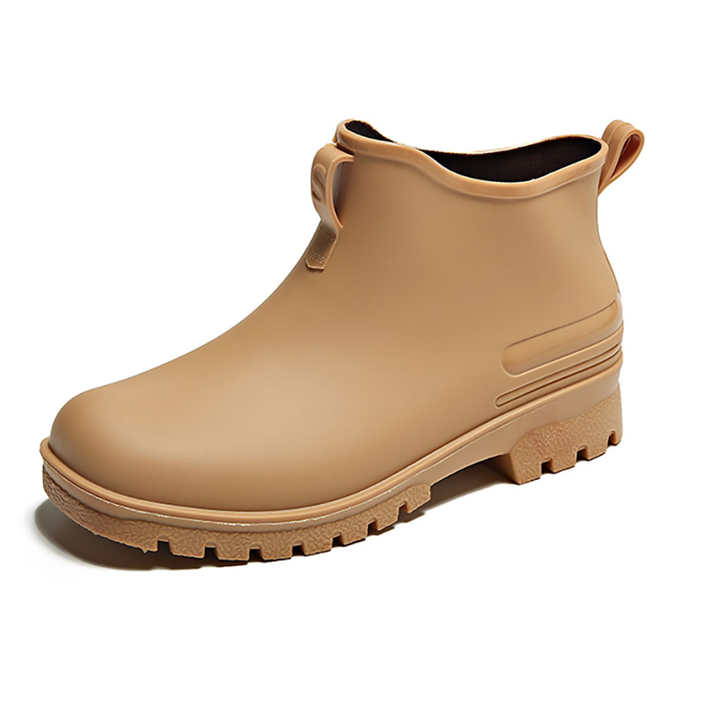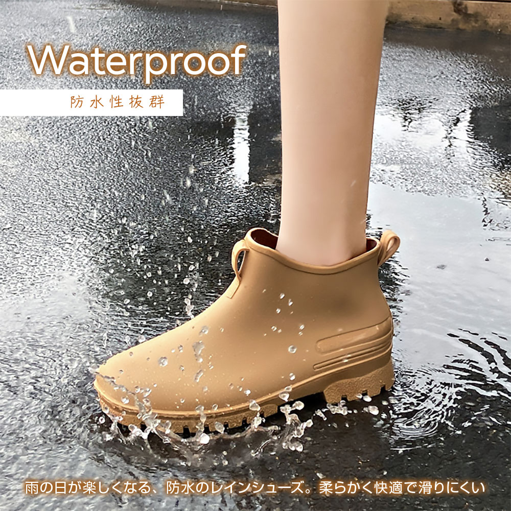 ローヒールで安定感があり歩きやすい、シンプルなショートレインブーツ。