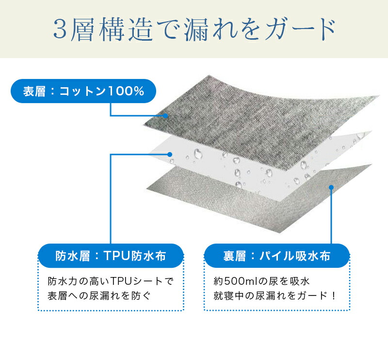 〇素材:表層/コットン100% 防水層/TPU防水布 裏層/パイル吸水布