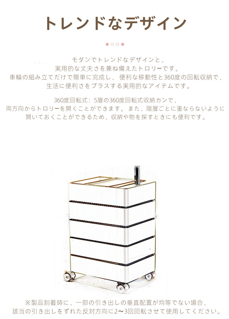 モダンでトレンドなデザインと、 実用的な丈夫さを兼ね備えたトロリーです。 車輪の組み立てだけで簡単に完成し、 便利な移動性と360度の回転収納で、 生活に便利さをプラスする実用的なアイテムです。