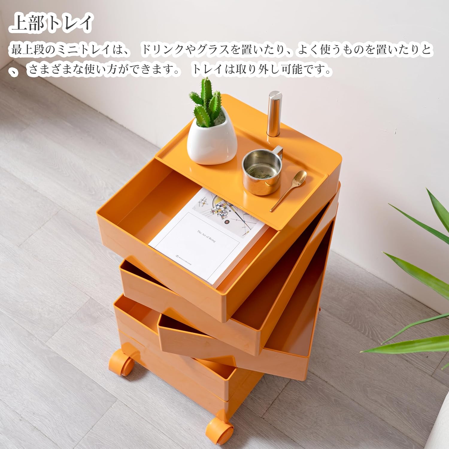 最上段のミニトレイは、 ドリンクやグラスを置いたり、よく使うものを置いたりと、 さまざまな使い方ができます。 トレイは取り外し可能です。
