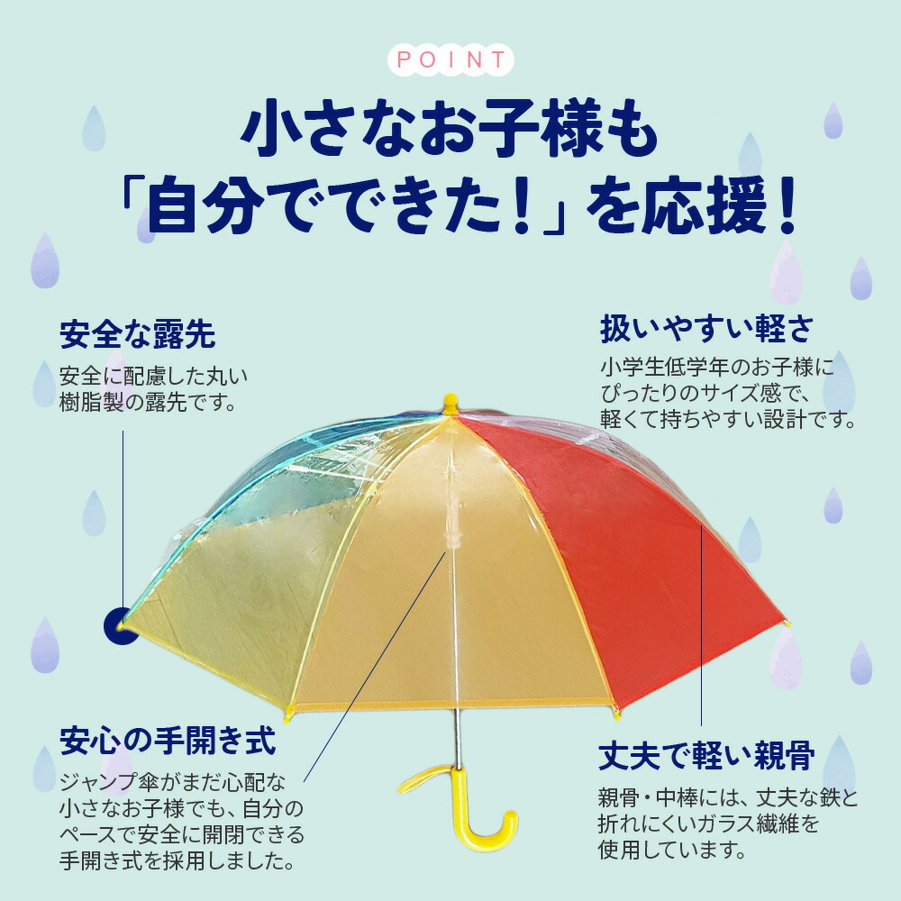 そして、パッと目を引くのは鮮やかな虹色のデザイン。この傘を開けば、まるで空に本物の虹がかかったかのように、お子様の心を掴んで離しません。憂鬱だった雨の日も、この傘と一緒なら、きっと外に出かけるのが楽しみになることでしょう。手元は、小さなお子様でも自分の力でゆっくりと安全に開閉できるよう、扱いやすい手開き式を採用しています。自分でできた、という小さな達成感も育んでくれるかもしれません。
