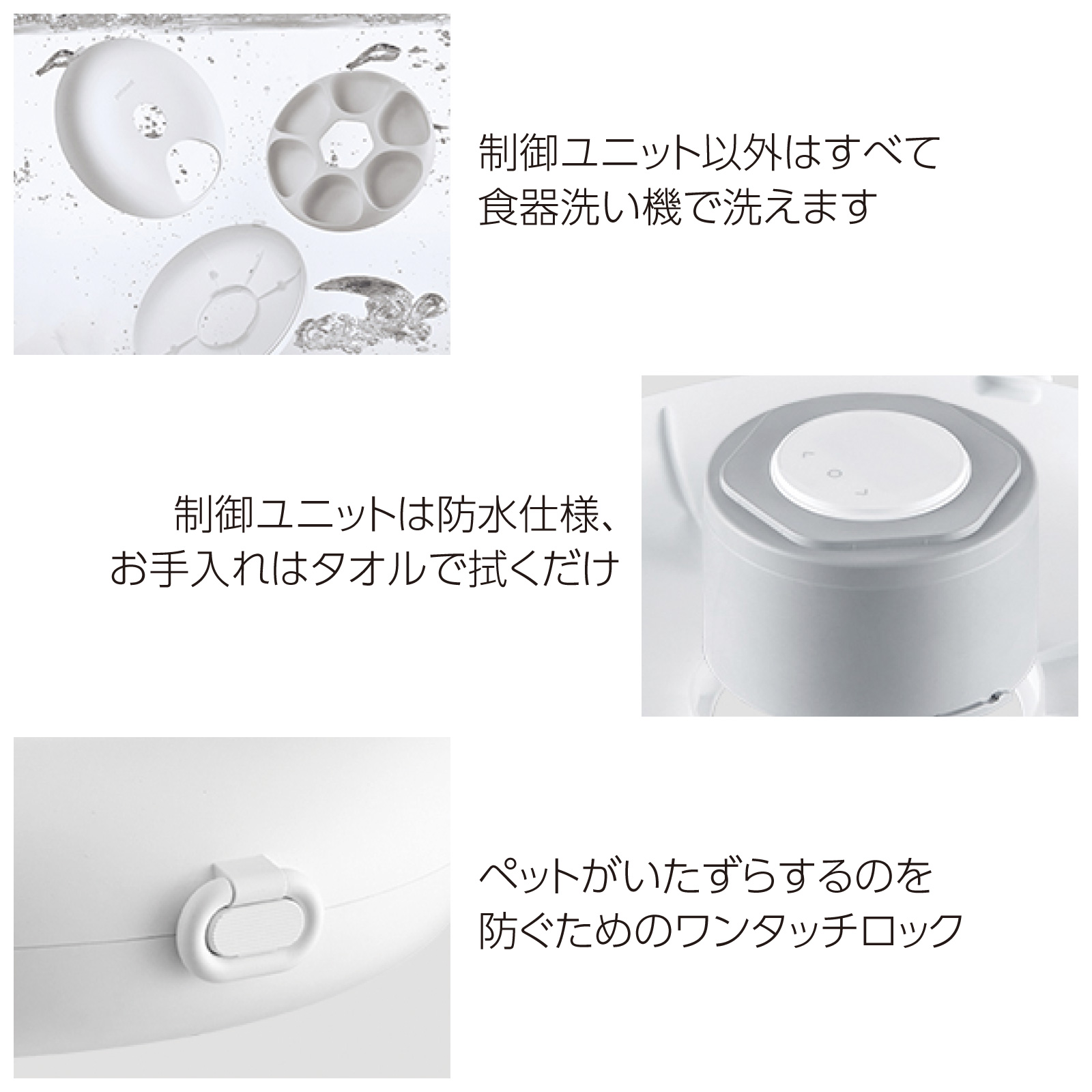 6つの給餌カップがあり、それぞれのカップには約70gのドライまたはセミウェット食品が入れられます。