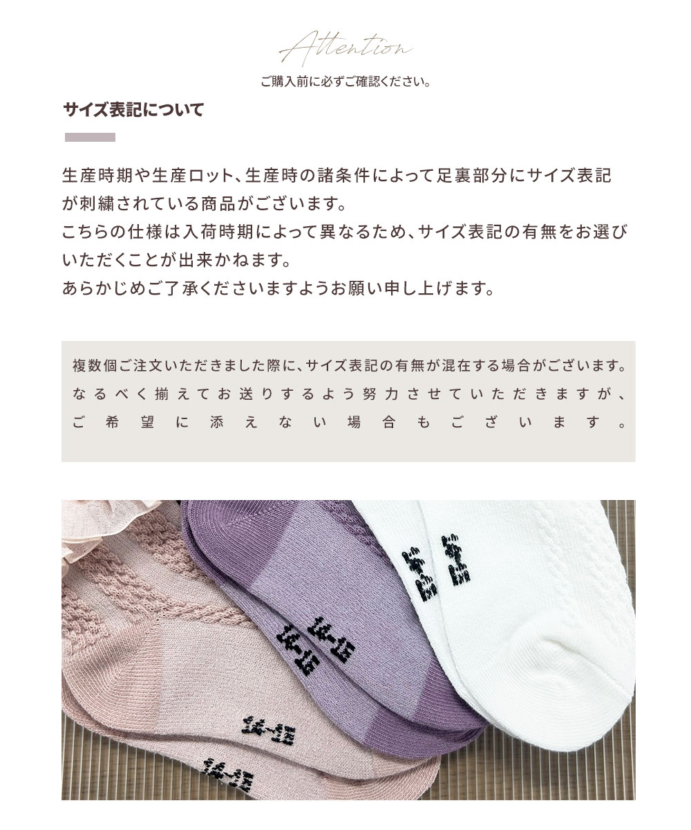 ▼タイプ(デザイン・素材・伸縮性)と生産時期により、同じサイズの靴下でも大きさは若干違う場合がございます。予めご了承ください。