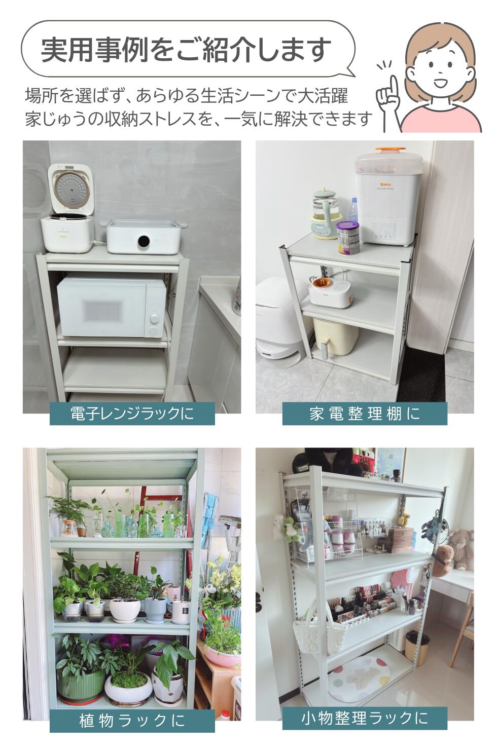 ※ キッチンの置物用の 収納棚、倉庫の整理用の メタルラック、商店の陳列用の 収納ラックとしては、ピッタリです。