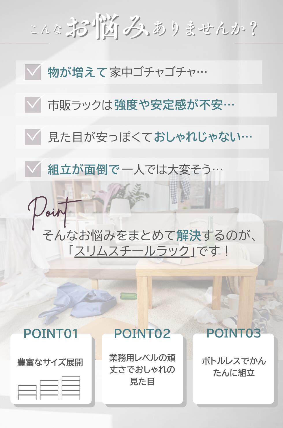 ※ 長く使える使いやすいこだわり満載の工夫。【1】補強用棚板対応可能で、重い物も安心収納。【2】頑丈なスチール素材で、長期間しっかり支える耐久性。【3】差し込むだけの簡単組立で、工具不要&手間いらず。【4】防水・防カビコーティングで、湿気の多い場所でも安心。【5】床を傷つけにくいキャップ付きで、設置場所を選ばない。